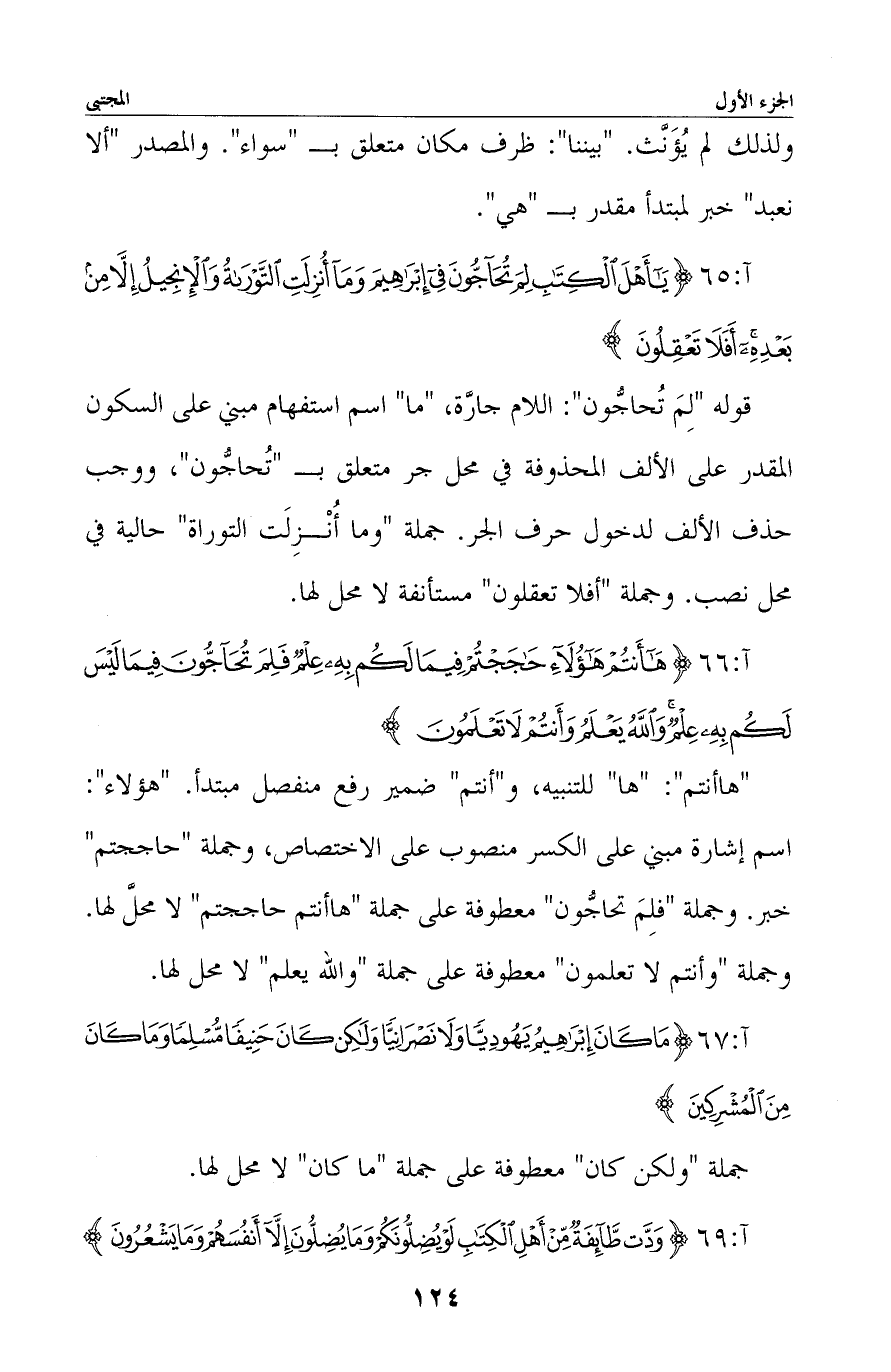 قوله «لِمَ تحاجون» : اللام جارة، «ما» اسم استفهام مبني على السكون المقدر على الألف المحذوفة في محل جر متعلق بـ «تحاجون» ، ووجب حذف الألف لدخول حرف الجر. جملة «وما أنزلت التوراة» حالية في محل نصب. وجملة «أفلا تعقلون» مستأنفة لا محل لها.
