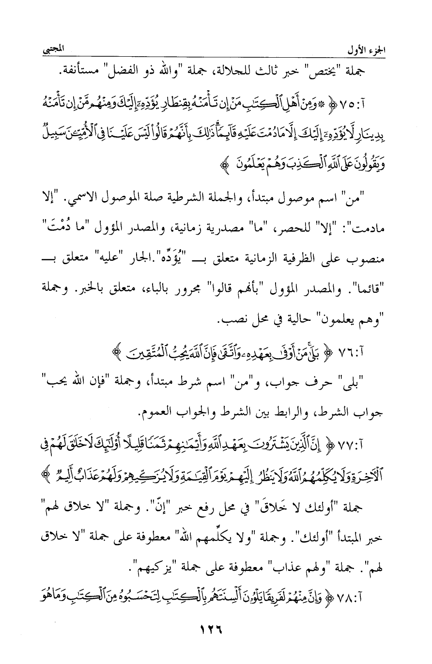75 - {وَمِنْ أَهْلِ الْكِتَابِ مَنْ إِنْ تَأْمَنْهُ بِقِنْطَارٍ يُؤَدِّهِ إِلَيْكَ وَمِنْهُمْ مَنْ إِنْ تَأْمَنْهُ بِدِينَارٍ لا يُؤَدِّهِ إِلَيْكَ إِلا مَا دُمْتَ عَلَيْهِ قَائِمًا ذَلِكَ بِأَنَّهُمْ قَالُوا لَيْسَ عَلَيْنَا فِي الأُمِّيِّينَ سَبِيلٌ وَيَقُولُونَ عَلَى اللَّهِ الْكَذِبَ وَهُمْ يَعْلَمُونَ}