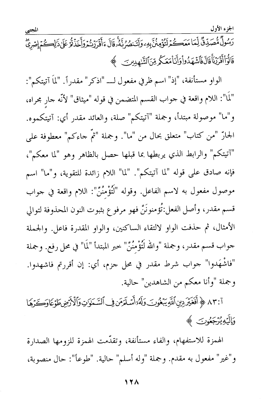 الواو مستأنفة، «إذ» اسم ظرفي مفعول لـ «اذكر» مقدرا. «لما آتيتكم» : «لما» : اللام واقعة في جواب القسم المتضمن في قوله «ميثاق» لأنّه جارٍ مجراه، و «ما» موصولة مبتدأ، وجملة «آتيتكم» صلة، والعائد مقدر أي: آتيتكموه. الجار «من كتاب» متعلق بحال من «ما» . وجملة «ثمّ جاءكم» معطوفة على «آتيتكم» والرابط الذي يربطها بما قبلها حصل بالظاهر وهو «لما معكم» ، فإنه صادق على قوله «لما آتيتكم» . «لما» اللام زائدة للتقوية، و «ما» اسم موصول مفعول به لاسم الفاعل. وقوله «لتؤمنُنَّ» : اللام واقعة في جواب قسم مقدر، وأصل الفعل: تُؤمنونَنَّ فهو مرفوع بثبوت النون المحذوفة لتوالي الأمثال، ثم حذفت الواو لالتقاء الساكنين، والواو المقدرة فاعل. والجملة جواب قسم مقدر، وجملة «والله لتؤمنن» خبر المبتدأ «لما» في محل رفع. وجملة «فاشهدوا» جواب شرط مقدر في محل جزم، أي: إن أقررتم فاشهدوا. وجملة «وأنا معكم من الشاهدين» حالية.