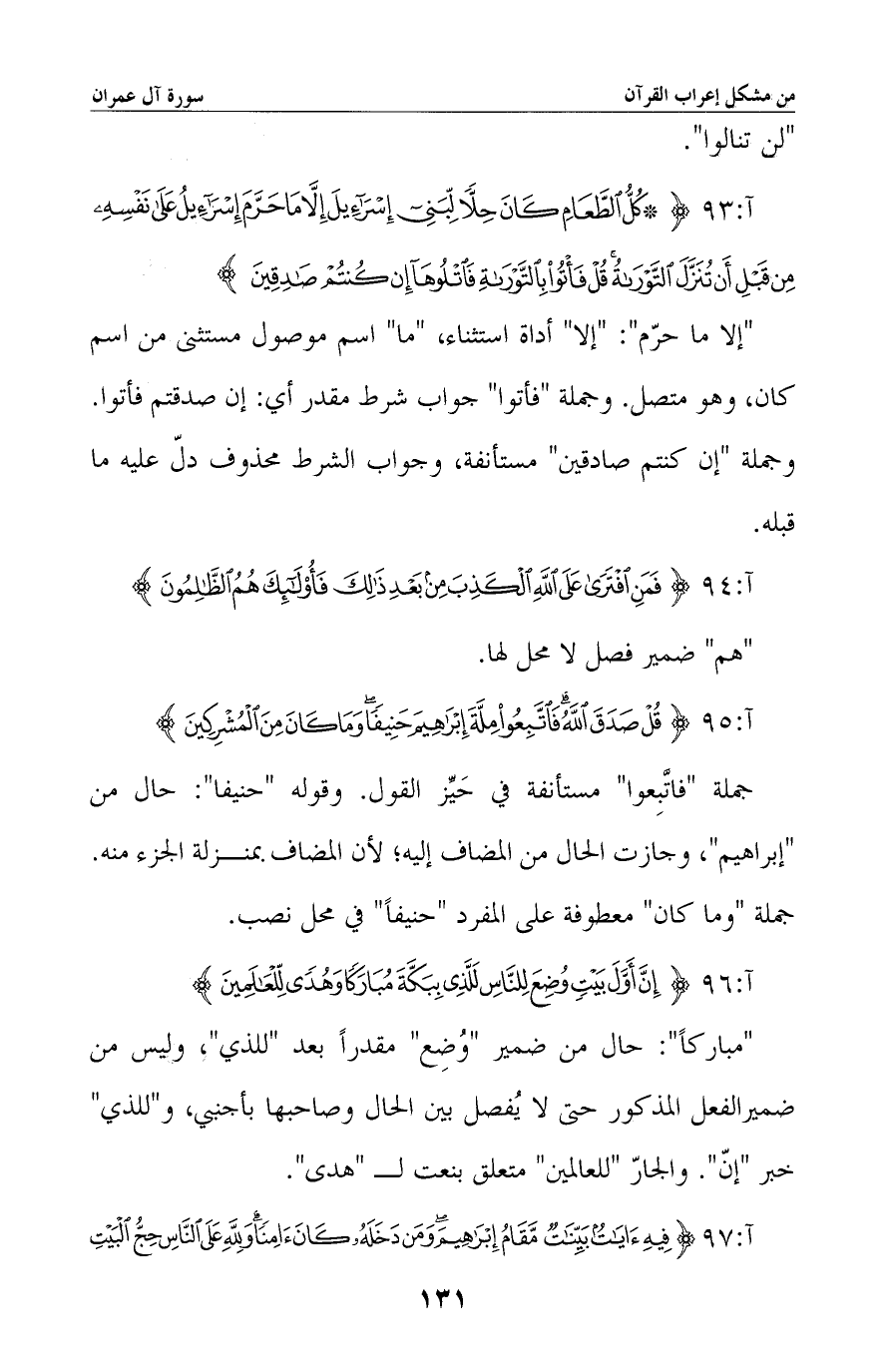 جملة «فاتبعوا» مستأنفة في حيز القول. وقوله «حنيفا» : حال من «إبراهيم» ، وجازت الحال من المضاف إليه؛ لأن المضاف بمنزلة الجزء منه. جملة «وما كان» معطوفة على المفرد «حنيفاً» في محل نصب.