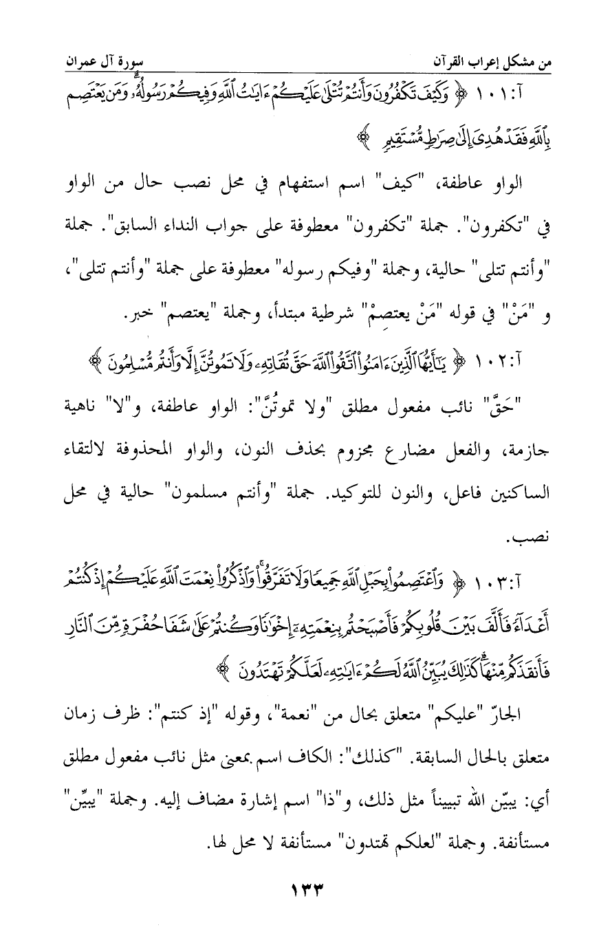 الواو عاطفة، «كيف» اسم استفهام في محل نصب حال من الواو في «تكفرون» . جملة «تكفرون» معطوفة على جواب النداء السابق. جملة «وأنتم تتلى» حالية، وجملة «وفيكم رسوله» معطوفة على جملة «وأنتم تتلى» ، و «من» في قوله «من يعتصم» شرطية مبتدأ، وجملة «يعتصم» خبر.