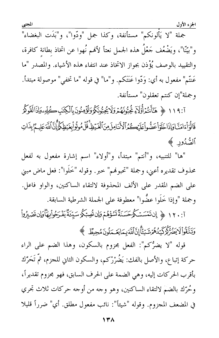 «ها» للتنبيه، و «أنتم» مبتدأ، و «أولاء» اسم إشارة مفعول به لفعل محذوف تقديره أعني، وجملة «تحبونهم» خبر. وقوله «خَلَوا» : فعل ماض مبني على الضم المقدر على الألف المحذوفة لالتقاء الساكنين، والواو فاعل. وجملة «وإذا خَلَوا عضُّوا» معطوفة على الجملة الشرطية السابقة.