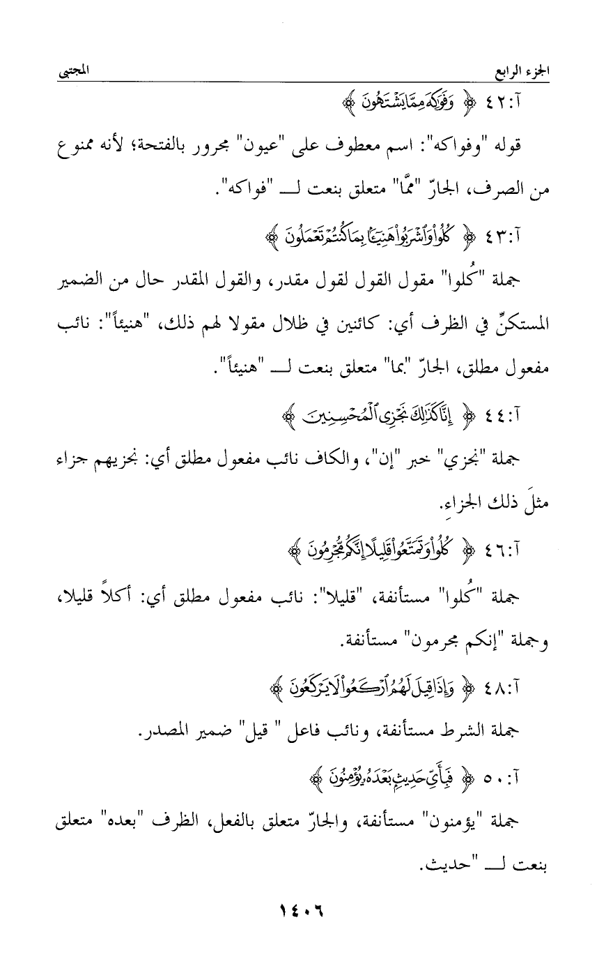 جملة «كلوا» مقول القول لقول مقدر، والقول المقدر حال من الضمير المستكنِّ في الظرف أي: كائنين في ظلال مقولا لهم ذلك، «هنيئا» : مفعول مطلق، الجار «بما» متعلق بنعت لـ «هنيئا» .