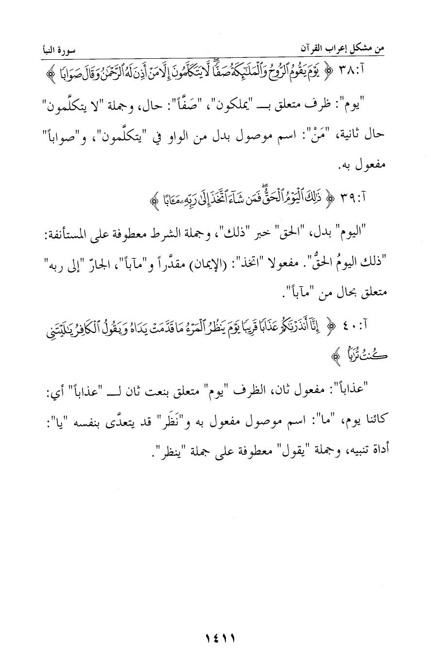 «اليوم» بدل، «الحق» خبر «ذلك» ، وجملة الشرط معطوفة على المستأنفة: «ذلك اليوم الحق» . مفعولا «اتخذ» : الإيمان مقدرا و «مآبا» ، الجار «إلى ربه» متعلق بحال من «مآبا» .