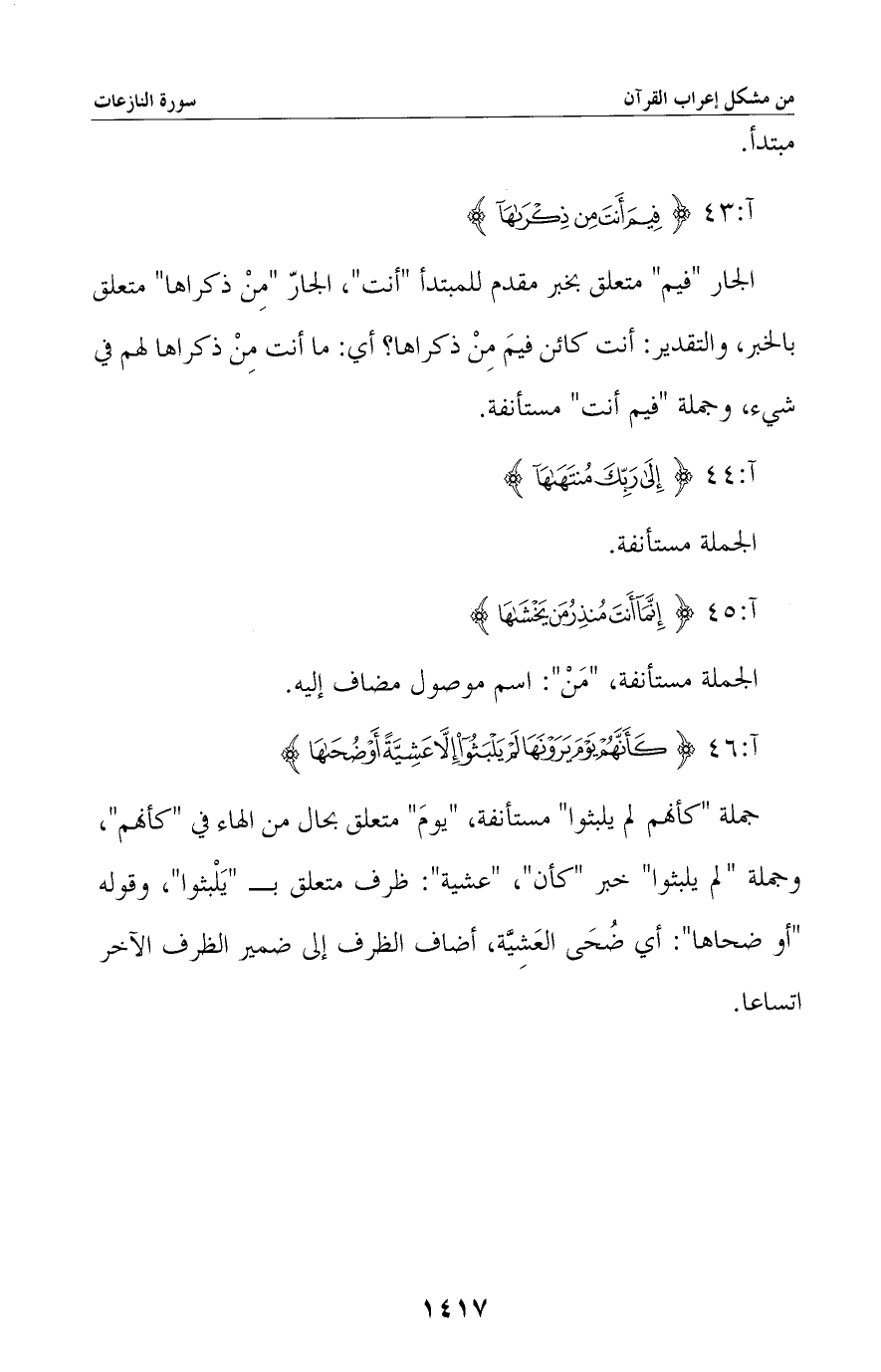 جملة «كأنهم لم يلبثوا» مستأنفة، «يوم» متعلق بحال من الهاء في «كأنهم» ، وجملة «لم يلبثوا» خبر «كأن» ، «عشية» : ظرف متعلق بـ «يلبثوا» ، وقوله «أو ضحاها» : أي ضحى العشية، أضاف الظرف إلى ضمير الظرف الآخر اتساعا.