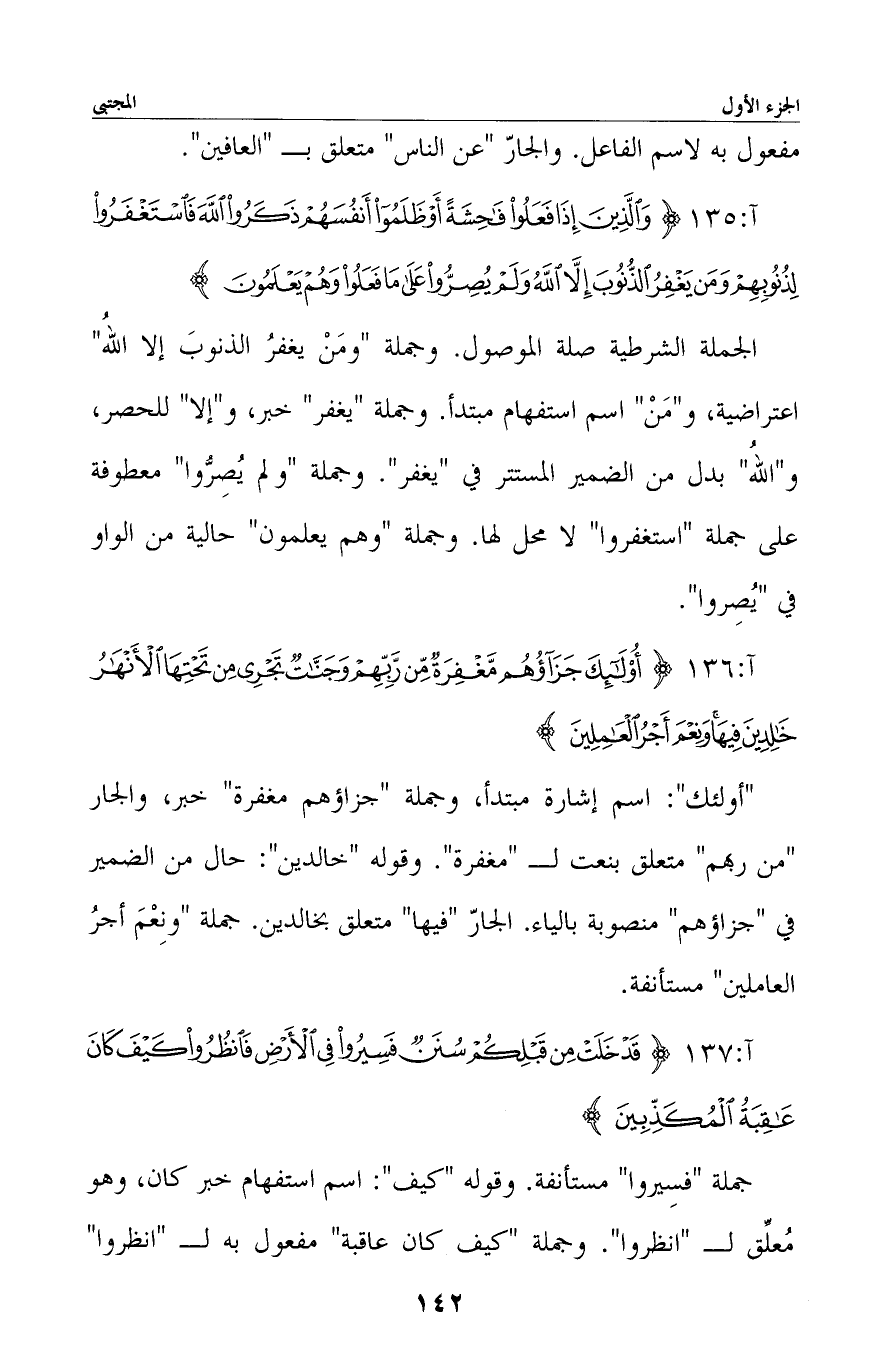 الجملة الشرطية صلة الموصول. وجملة «ومن يغفر الذنوب إلا الله» اعتراضية، و «من» اسم استفهام مبتدأ. وجملة «يغفر» خبر، و «إلا» للحصر، و «الله» بدل من الضمير المستتر في «يغفر» . وجملة «ولم يُصِرُّوا» معطوفة على جملة «استغفروا» لا محل لها. وجملة «وهم يعلمون» حالية من الواو في «يُصِروا» .