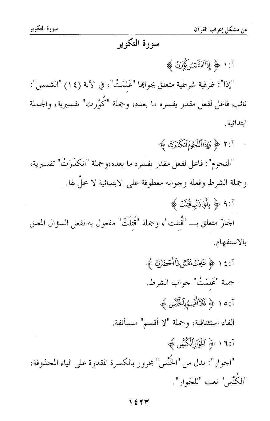 «إذا» : ظرفية شرطية متعلق بجوابها {عَلِمَتْ} ، في الآية (14) «الشمس» : نائب فاعل لفعل مقدر يفسره ما بعده، وجملة «كُوِّرت» تفسيرية، والجملة ابتدائية.