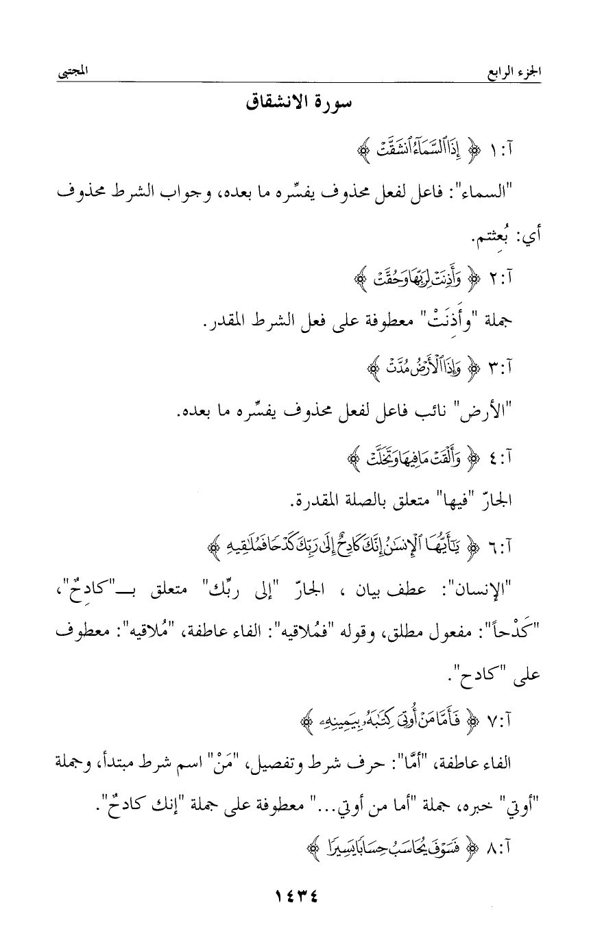 «الإنسان» : عطف بيان، الجار «إلى ربك» متعلق «بكادح» ، «كَدْحًا» : مفعول مطلق، وقوله «فملاقيه» : الفاء عاطفة، «ملاقيه» : معطوف على «كادح» .
