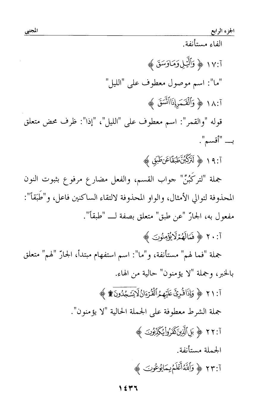 جملة «لتركبن» جواب القسم، والفعل مضارع مرفوع بثبوت النون المحذوفة لتوالي الأمثال، والواو المحذوفة لالتقاء الساكنين فاعل، و «طبقًا» : مفعول به، الجار «عن طبق» متعلق بصفة لـ «طبقًا» .