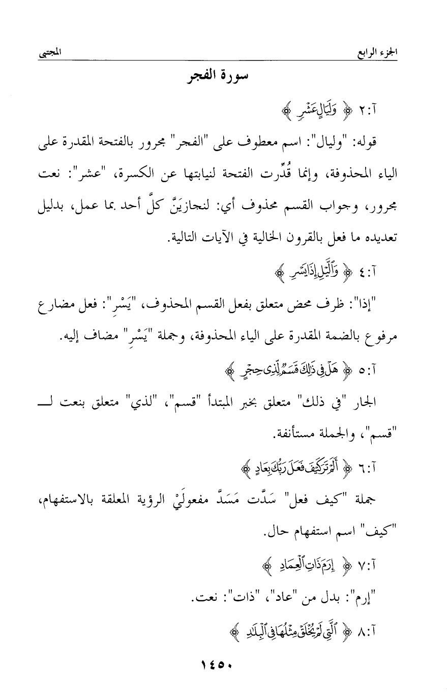 اسم معطوف على «الفجر» مجرور بالفتحة المقدرة على الياء المحذوفة، وإنما قدرت الفتحة لنيابتها عن الكسرة، «عشر» : نعت مجرور، وجواب القسم محذوف أي: لنجازين كل أحد بما عمل، بدليل تعديده ما فعل بالقرون الخالية.
