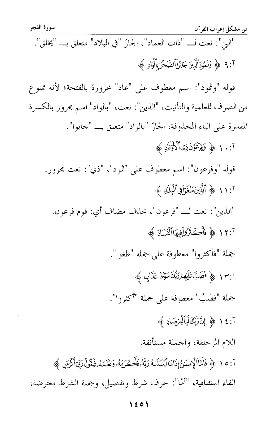 قوله «وثمود» : اسم معطوف على «عاد» مجرورة بالفتحة؛ لأنه ممنوع من الصرف للعلمية والتأنيث، «الذين» : نعت، «بالواد» اسم مجرور بالكسرة المقدرة على الياء المحذوفة، الجار «بالواد» متعلق بـ «جابوا» .