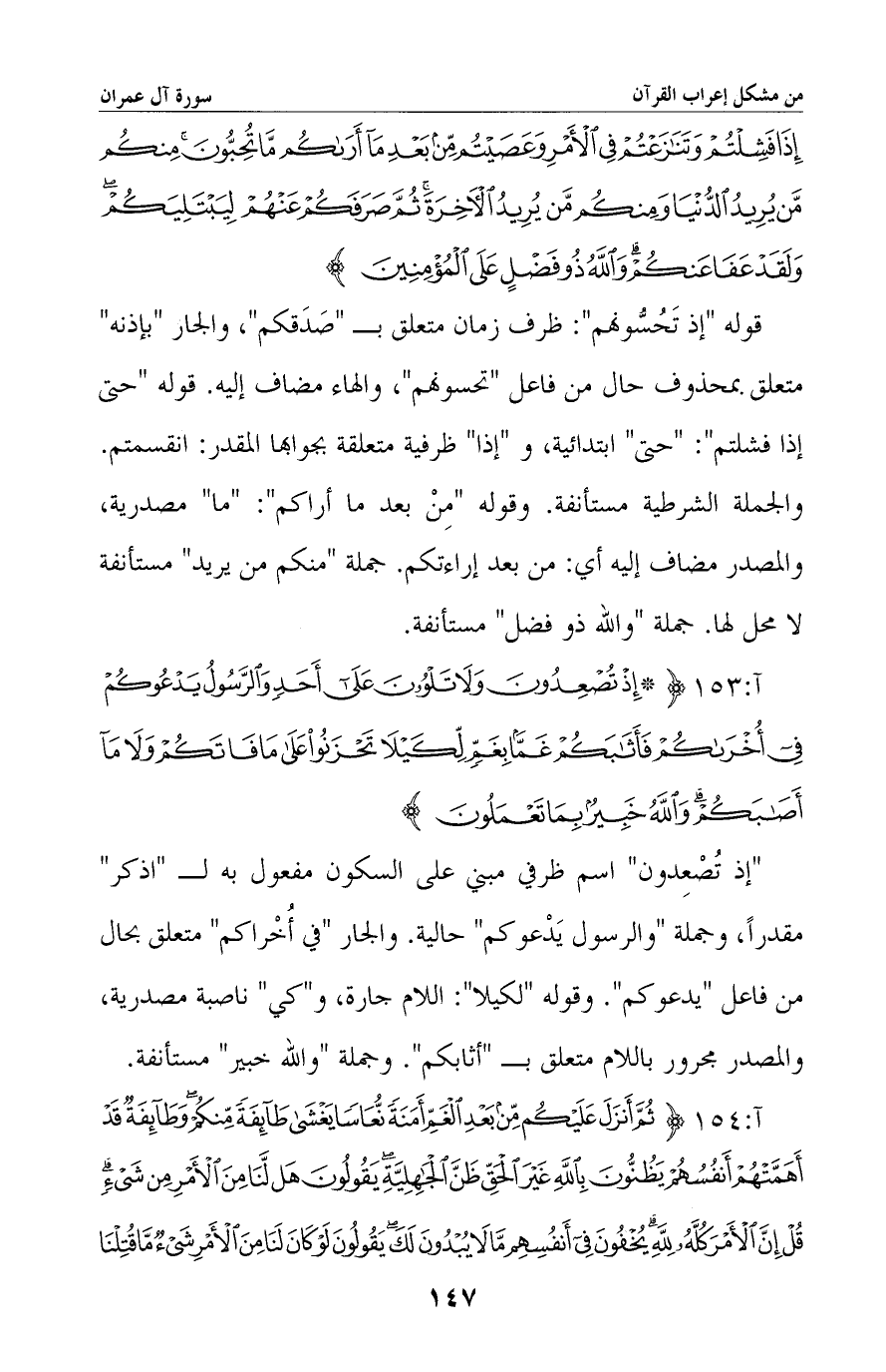 «إذ تصعدون» اسم ظرفي مبني على السكون مفعول به لـ «اذكر» مقدراً، وجملة «والرسول يدعوكم» حالية. والجار «في أخراكم» متعلق بحال من فاعل «يدعوكم» . وقوله «لكيلا» : اللام جارة، و «كي» ناصبة مصدرية، والمصدر مجرور باللام متعلق بـ «أثابكم» . وجملة «والله خبير» مستأنفة.
