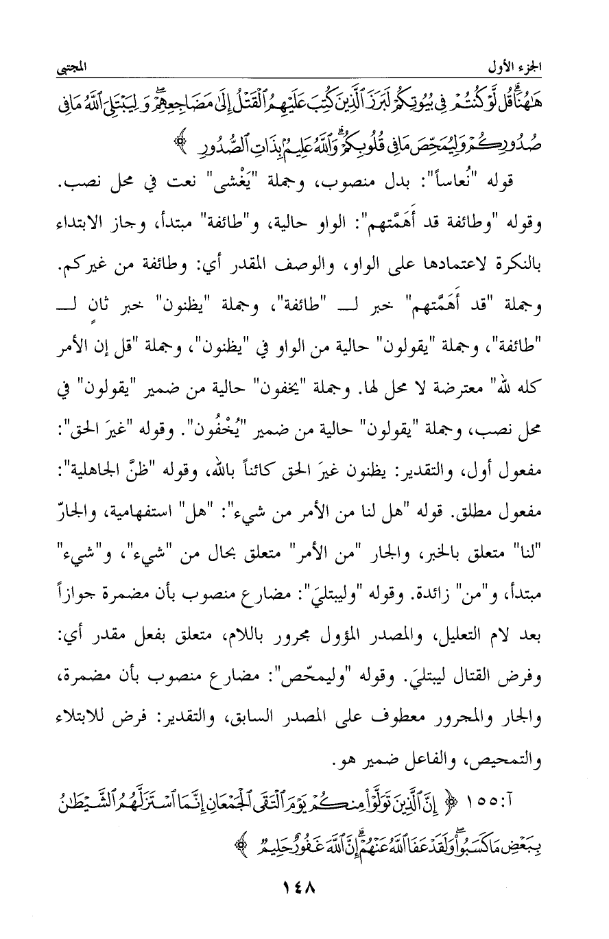 قوله «نعاساً» : بدل منصوب، وجملة «يغشى» نعت في محل نصب. وقوله «وطائفة قد أهمتهم» : الواو حالية، و «طائفة» مبتدأ، وجاز الابتداء بالنكرة لاعتمادها على الواو، والوصف المقدر أي: وطائفة من غيركم. وجملة «قد أهمتهم» خبر لـ «طائفة» ، وجملة «يظنون» خبر ثانٍ لـ «طائفة» ، وجملة «يقولون» حالية من الواو في «يظنون» ، وجملة «قل إن الأمر كله لله» معترضة لا محل لها. وجملة «يخفون» حالية من ضمير «يقولون» في محل نصب، وجملة «يقولون» حالية من ضمير «يخفون» . وقوله «غير الحق» : مفعول أول، والتقدير: يظنون غير الحق كائناً بالله، وقوله «ظن الجاهلية» : مفعول مطلق. قوله «هل لنا من الأمر من شيء» : «هل» استفهامية، و «لنا» متعلق بالخبر، والجار «من الأمر» متعلق بحال «من شيء» ، و «شيء» مبتدأ، و «من» زائدة. وقوله «وليبتلي» : مضارع منصوب بأن مضمرة جوازاً بعد لام التعليل، والمصدر المؤول مجرور باللام، متعلق بفعل مقدر أي: وفرض القتال ليبتلي. وقوله «وليمحّص» : مضارع منصوب بأن مضمرة، والجار والمجرور معطوف على المصدر السابق، والتقدير: فرض للابتلاء والتمحيص، والفاعل ضمير هو.