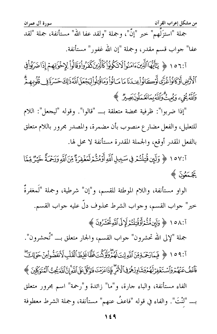 الفاء مستأنفة، والباء جارة، و «ما» زائدة و «رحمة» اسم مجرور متعلق بـ «لنت» . والفاء في قوله «فاعف عنهم» مستأنفة، وجملة الشرط معطوفة -[150]- على جملة «شاورهم» .