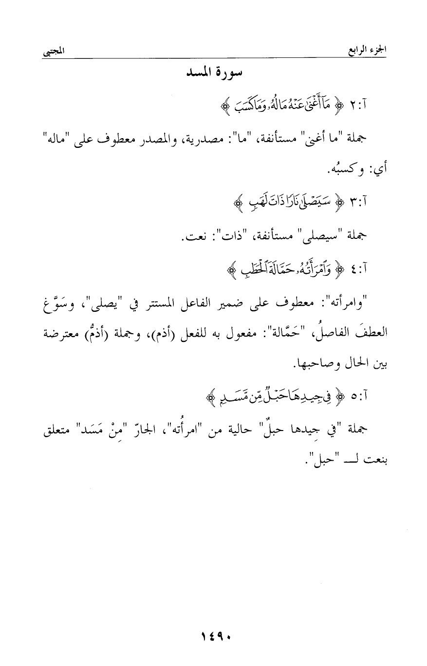 «وامرأته» : معطوف على الفاعل في «يصلى» ، وسوغ العطف الفاصل، «حمالة» : مفعول به لفعل (أذم) ، وجملة (أذم) معترضة بين الحال وصاحبها.