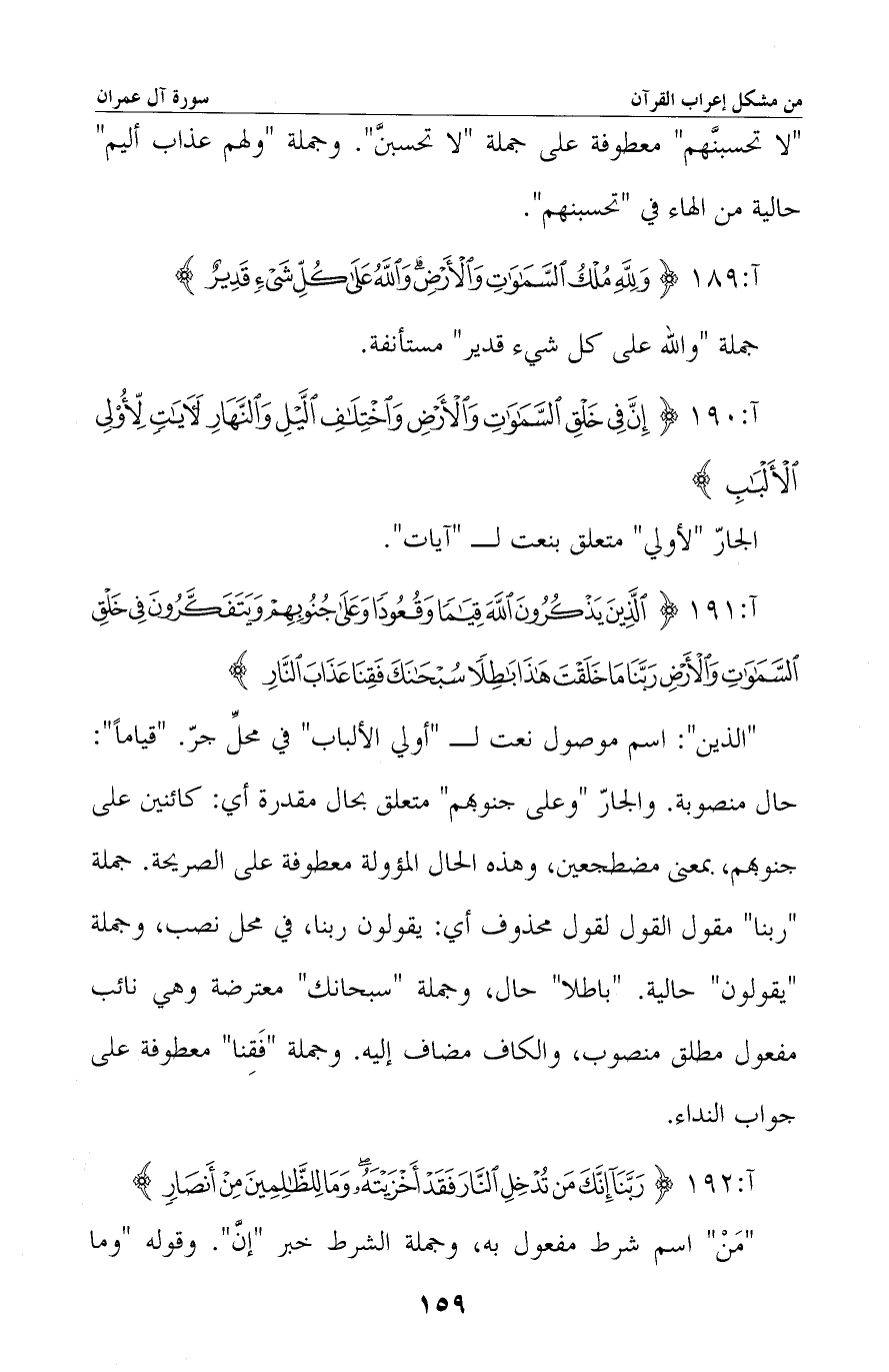 «الذين» : اسم موصول نعت لـ «أولي الألباب» في محل جرّ. «قياماً» : حال منصوبة. والجار «وعلى جنوبهم» متعلق بحال مقدرة أي: كائنين على جنوبهم، بمعنى مضطجعين، وهذه الحال المؤولة معطوفة على الصريحة. جملة «ربنا» مقول القول لقول محذوف أي: يقولون ربنا، في محل نصب، وجملة «يقولون» حالية. «باطلا» حال، وجملة «سبحانك» معترضة وهي نائب مفعول مطلق منصوب، والكاف مضاف إليه. وجملة «فقنا» معطوفة على جواب النداء.