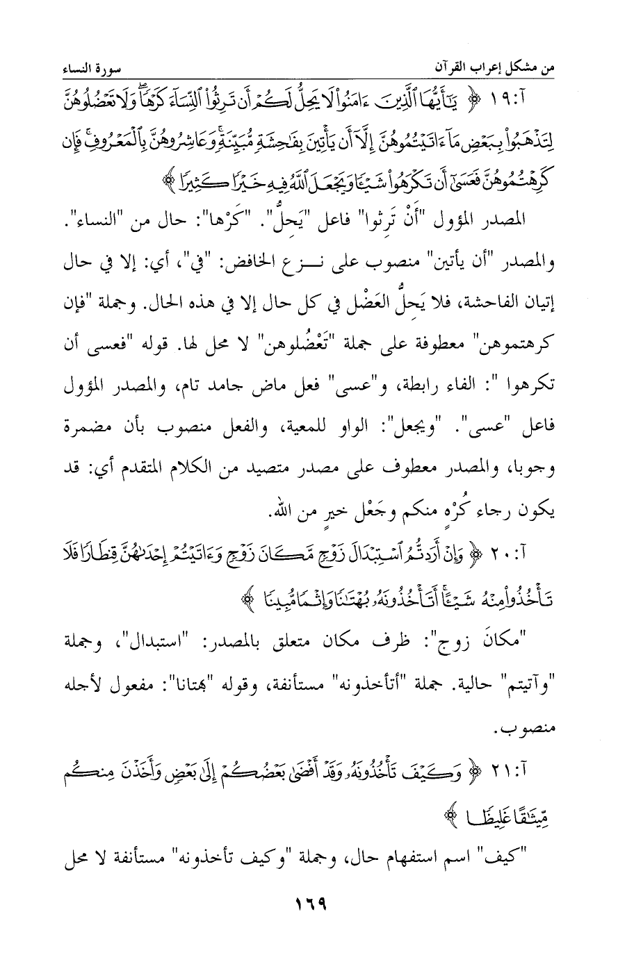 المصدر المؤول «أن ترثوا» فاعل «يحل» . «كرها» : حال من «النساء» . والمصدر «أن يأتين» منصوب على نزع الخافض «في» ، أي: إلا في حال إتيان الفاحشة، فلا يحل العضل في كل حال إلا في هذه الحال. وجملة «فإن كرهتموهن» معطوفة على جملة «تعضلوهن» لا محل لها. قوله «فعسى أن تكرهوا» : الفاء رابطة، و «عسى» فعل ماض جامد تام، والمصدر المؤول فاعل «عسى» . «ويجعل» : الواو للمعية، والفعل منصوب بأن مضمرة وجوبا، والمصدر معطوف على مصدر متصيد من الكلام المتقدم أي: قد يكون رجاء كرهٍ منكم وجَعْل خيرٍ من الله.