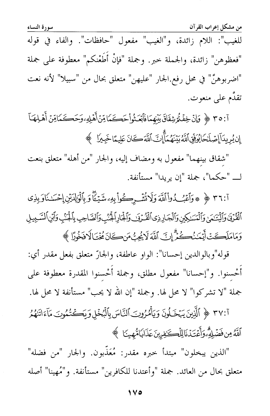«الذين يبخلون» مبتدأ خبره مقدر: معذّبون. والجار «من فضله» متعلق بحال من العائد. جملة «وأعتدنا للكافرين» مستأنفة. و «مُهينا» أصله -[176]- مُؤَهْوِنا اسم فاعل من الثلاثي المزيد أهان، حذفت الهمزة قياسا على حذفها من المضارع المتكلم، فصار مُهْوِنًا نقلت كسرة الواو إلى الهاء فصار مُهِوْنا، فقلبت الواو ياء لسكونها وانكسار ما قبلها.