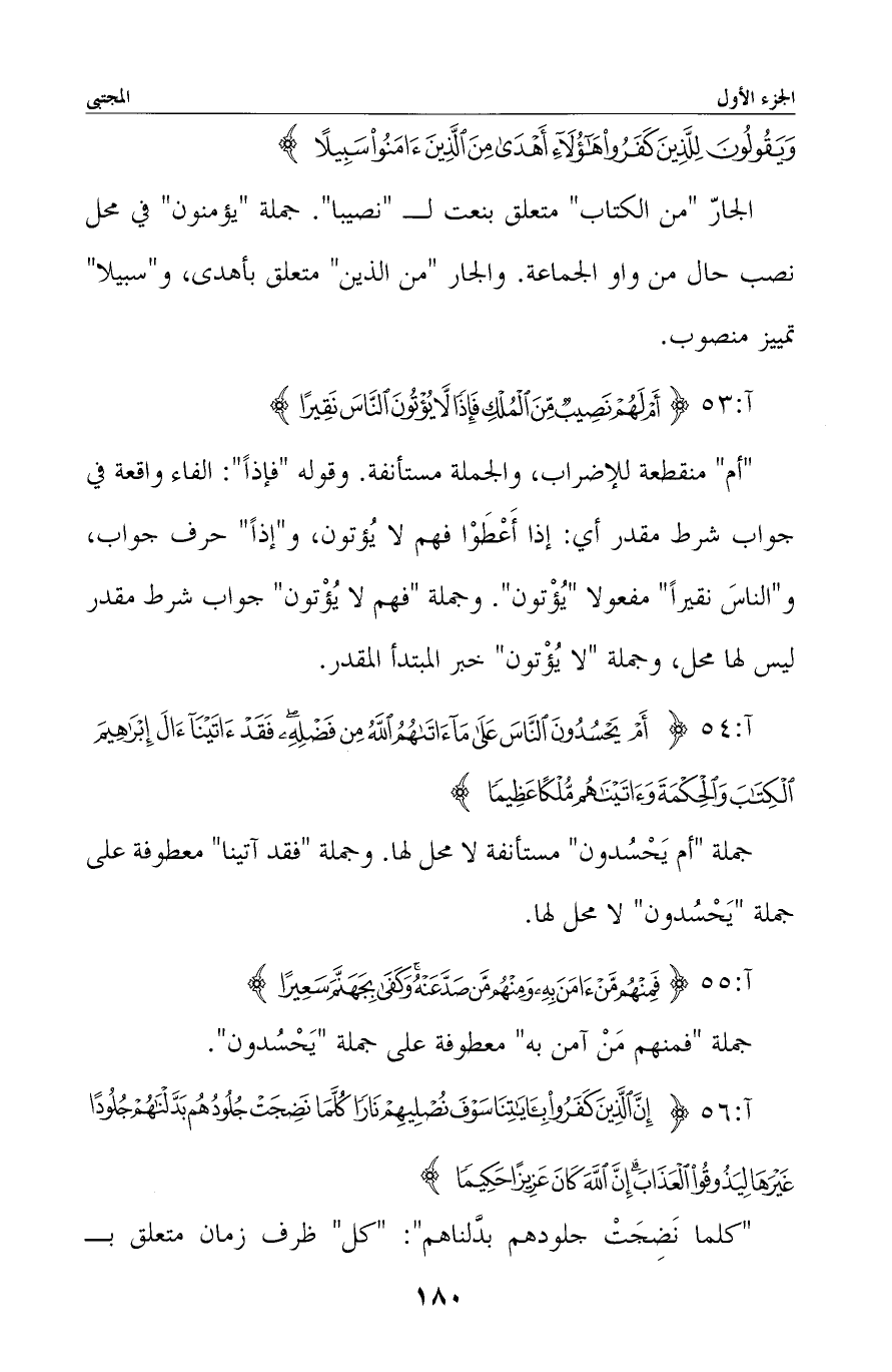 «أم» منقطعة للإضراب، والجملة مستأنفة. وقوله «فإذاً» : الفاء واقعة في جواب شرط مقدر أي: إذا أعطوا فهم لا يؤتون، و «إذًا» حرف جواب، و «الناس نقيراً» مفعولا «يؤتون» . وجملة «فهم لا يؤتون» جواب شرط مقدر ليس لها محل، وجملة «لا يؤتون» خبر المبتدأ المقدر.