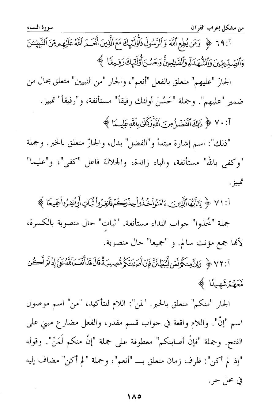 الجار «عليهم» متعلق بالفعل أنعم، والجار «من النبيين» متعلق بحال من ضمير «عليهم» . وجملة «حسن أولئك رفيقًا» مستأنفة، و «رفيقًا» تمييز.