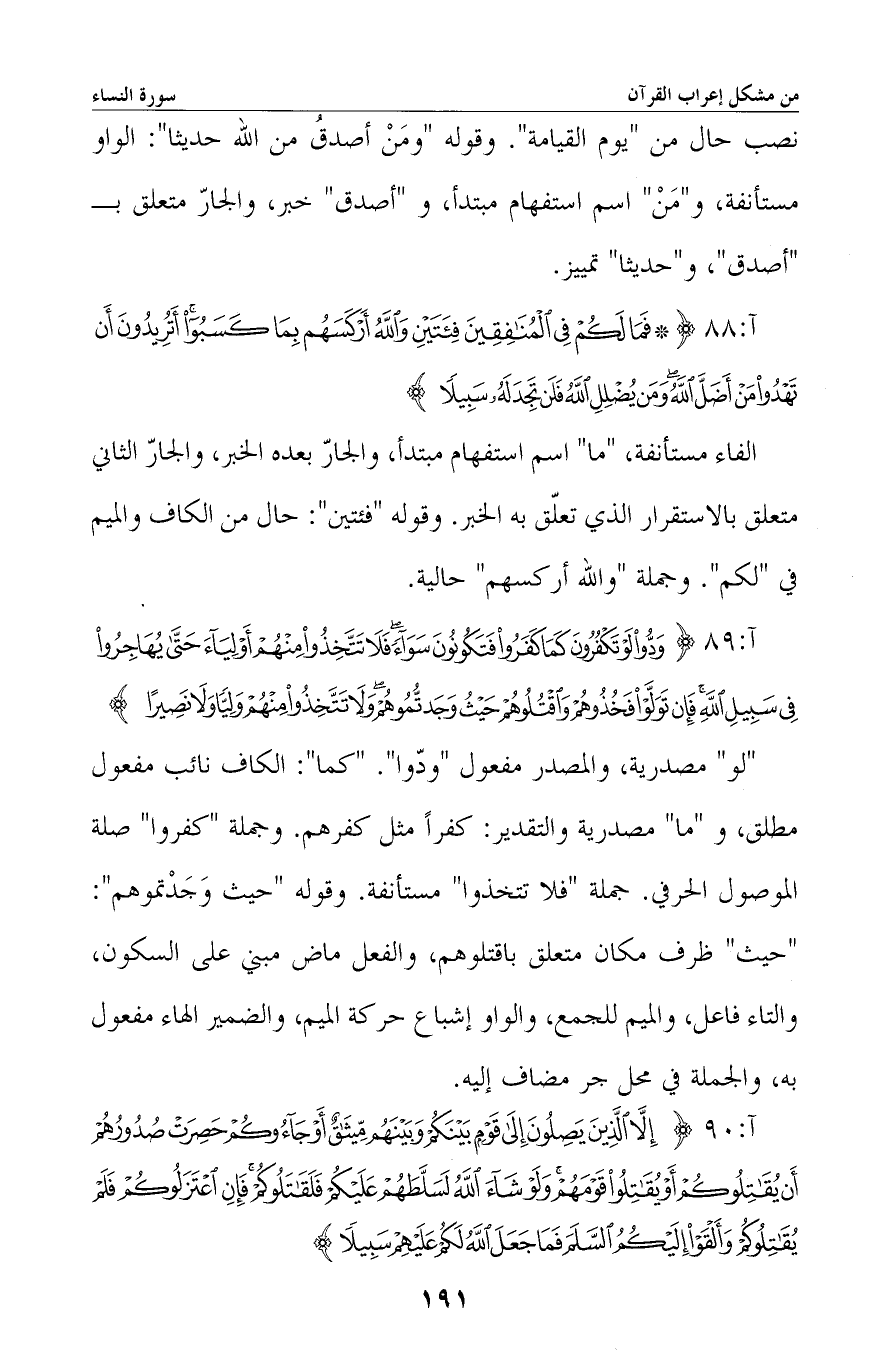 جملة «بينكم وبينهم ميثاق» نعت لقوم في محل جر. وجملة «حصرت صدورهم» حال من الواو في «جاءوكم» . والمصدر «أن يقاتلوكم» منصوب على نزع الخافض (عن) . وقوله «فلقاتلوكم» : الفاء عاطفة على الجواب، واللام واقعة في جواب «لو» لتأكيد الربط، وجملة «ولو شاء الله» مستأنفة لا محل لها. وجملة «فإن اعتزلوكم» معطوفة على جملة «لو شاء الله» لا محل لها. وجملة «فما جعل» جواب الشرط في محل جزم.