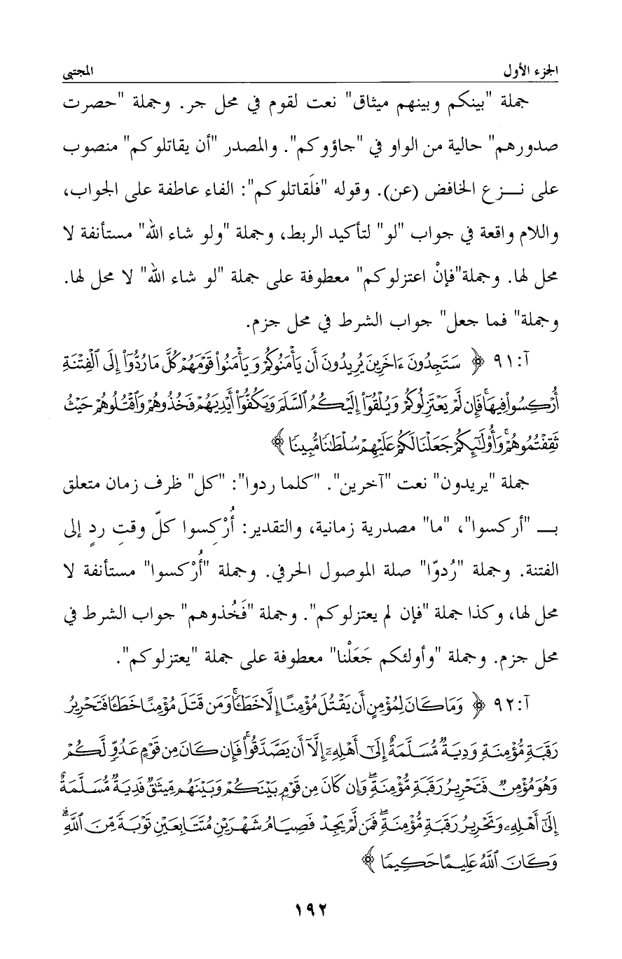 جملة «يريدون» نعت «آخرين» . «كلما ردوا» : «كل» ظرف زمان متعلق بـ «أركسوا» ، «ما» مصدرية زمانية، والتقدير: أركسوا كلّ وقت ردٍ إلى الفتنة. وجملة «ردوّا» صلة الموصول الحرفي. وجملة «أركسوا» مستأنفة لا محل لها، وكذا جملة «فإن لم يعتزلوكم» . وجملة «فخذوهم» جواب الشرط في محل جزم. وجملة «وأولئكم جعلنا» معطوفة على جملة «يعتزلوكم» .