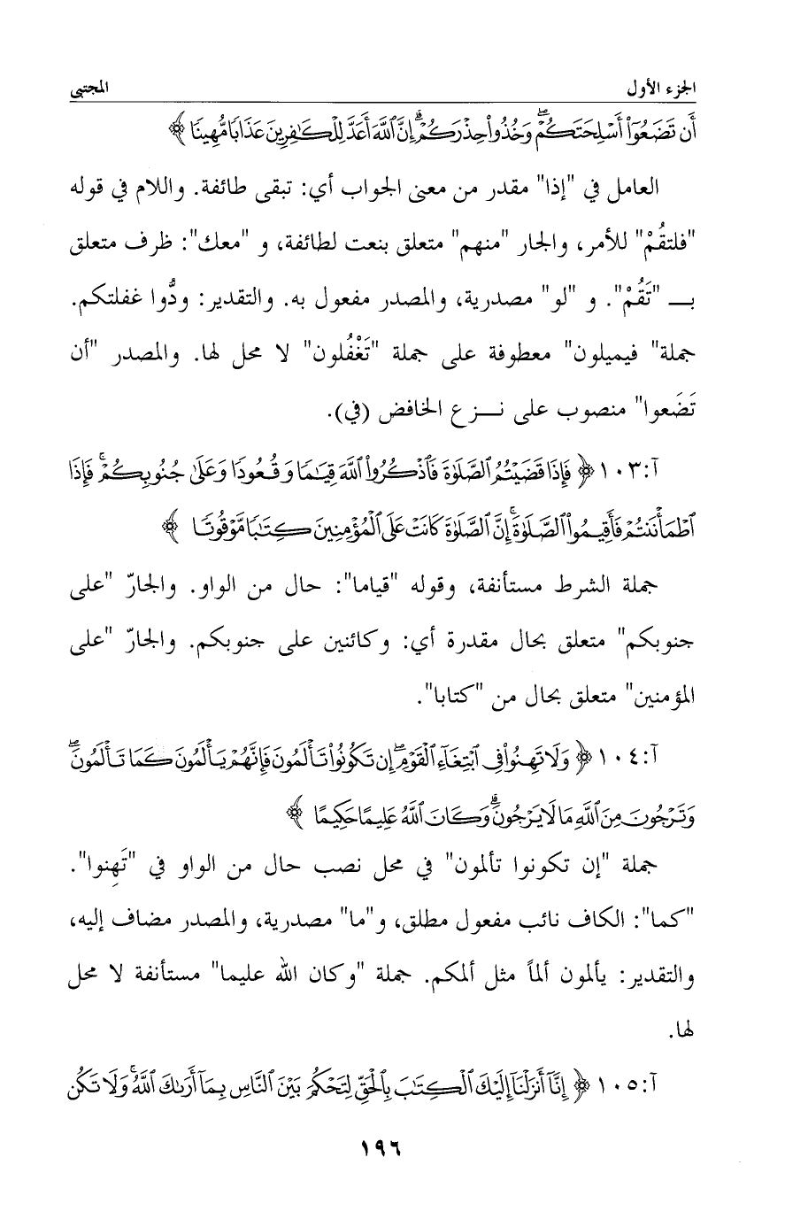 جملة الشرط مستأنفة، وقوله «قياما» : حال من الواو. والجار «على جنوبكم» متعلق بحال مقدرة أي: وكائنين على جنوبكم. والجار «على المؤمنين» متعلق بحال من «كتابا» .