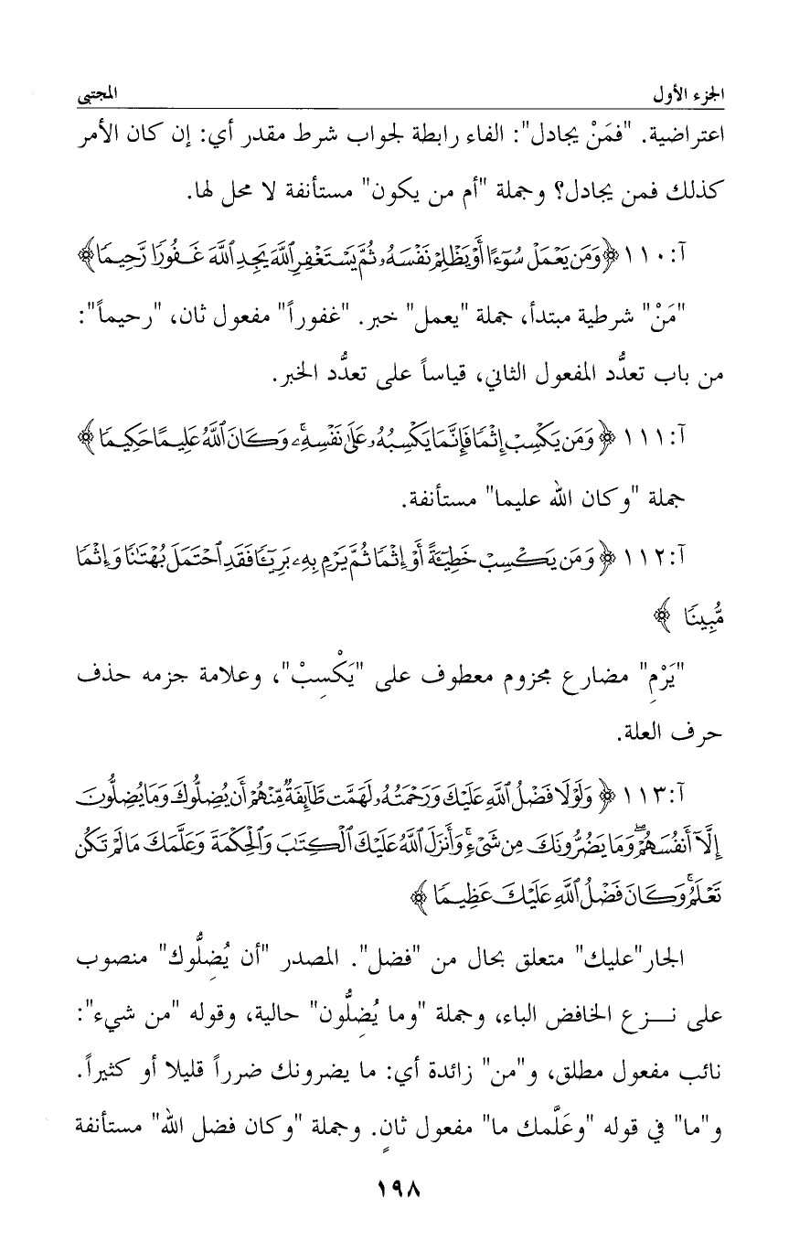 الجار «عليك» متعلق بحال من «فضل» . المصدر «أن يضلوك» منصوب على نزع الخافض الباء، وجملة «وما يضلُّون» حالية، وقوله «من شيء» : نائب مفعول مطلق، و «من» زائدة أي: ما يضرونك ضررًا قليلا أو كثيرًا. و «ما» في قوله «وعلّمك ما» مفعول ثانٍ. وجملة «وكان فضل الله» مستأنفة -[199]- لا محل لها.