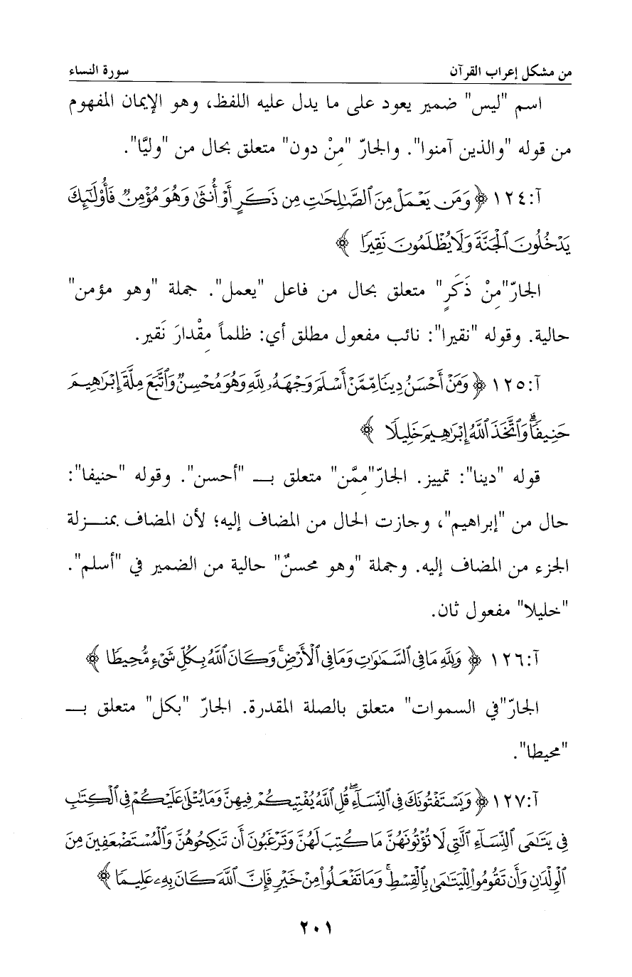 قوله «وما يتلى عليكم» : اسم موصول معطوف على الجلالة. والمصدر «أن تنكحوهن» منصوب على نزع الخافض «في» . «والمستضعفين» اسم معطوف على «يتامى» . والمصدر «أن تقوموا» معطوف على «المستضعفين» . الجار «بالقسط» متعلق بحال من الواو في «تقوموا» أي: ملتبسين بالقسط. «وما تفعلوا من خير» : الواو مستأنفة، و «ما» شرطية مفعول به، والجار «من خير» متعلق بصفة لـ «ما» .