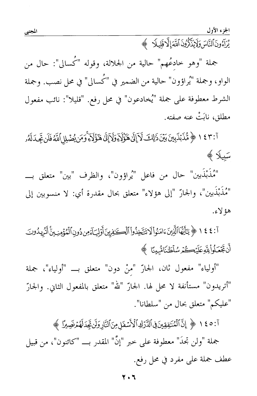 «مذبذبين» حال من فاعل {يُرَاءُونَ} ، والظرف «بين» متعلق بـ «مذبذبين» ، والجار «إلى هؤلاء» متعلق بحال مقدرة أي: لا منسوبين إلى هؤلاء.