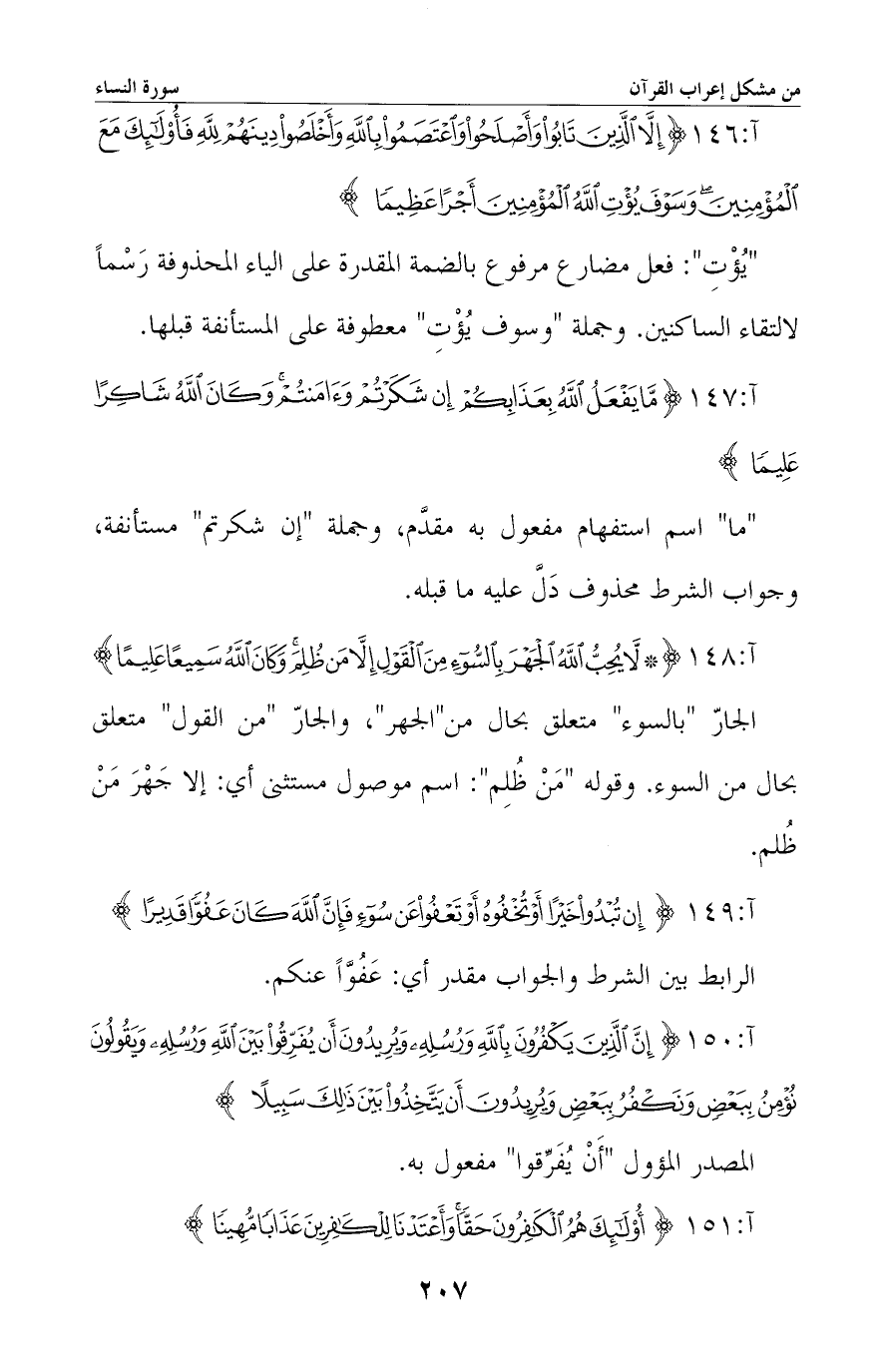 الجار «بالسوء» متعلق بحال من «الجهر» ، والجار «من القول» متعلق بحال من السوء. وقوله «من ظلم» : اسم موصول مستثنى أي: إلا جَهْرَ مَنْ ظُلم.