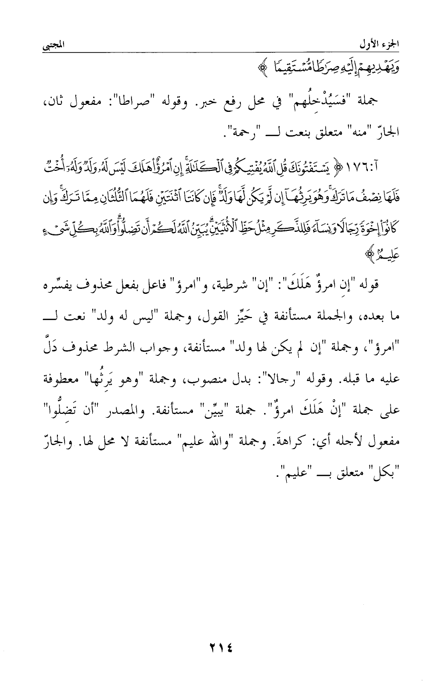 قوله «إن امرؤ هلك» : «إن» شرطية، و «امرؤ» فاعل بفعل محذوف يفسره ما بعده، والجملة مستأنفة في حيز القول، وجملة «ليس له ولد» نعت لـ «امرؤ» ، وجملة «إن لم يكن لها ولد» مستأنفة، وجواب الشرط محذوف دلّ عليه ما قبله. وقوله «رجالا» : بدل منصوب، وجملة «وهو يرثها» معطوفة على جملة «إن امرؤ هلك» . جملة «يبين» مستأنفة. والمصدر «أن تضلُّوا» مفعول لأجله أي: كراهة. وجملة «والله عليم» مستأنفة لا محل لها. والجار «بكل» متعلق بـ «عليم» .