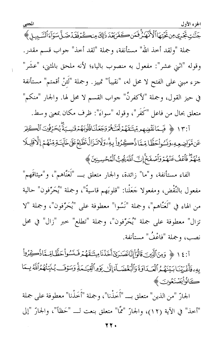 الجارّ «من الذين» متعلق بـ «أخذنا» ، وجملة «أخذنا» معطوفة على جملة {أَخَذَ} في الآية (12) ، والجار «ممَّا» متعلق بنعت لـ «حظا» والجار «إلى -[221]- يوم» متعلق بـ «أغرينا» . وجملة «وسوف ينبئهم» مستأنفة لا محل لها.