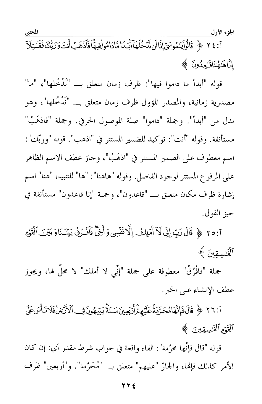 قوله «أبداً ما داموا فيها» : ظرف زمان متعلق بـ «ندخلها» ، «ما» مصدرية زمانية، والمصدر المؤول ظرف زمان متعلق بـ «ندخلها» ، وهو بدل من «أبداً» . وجملة «داموا» صلة الموصول الحرفي. وجملة «فاذهب» مستأنفة. وقوله «أنت» : توكيد للضمير المستتر في «اذهب» . قوله «وربّك» : اسم معطوف على الضمير المستتر في «اذهب» ، وجاز عطف الاسم الظاهر على المرفوع المستتر لوجود الفاصل. وقوله «هاهنا» : «ها» للتنبيه، «هنا» اسم إشارة ظرف مكان متعلق بـ «قاعدون» ، وجملة «إنا قاعدون» مستأنفة في حيز القول.
