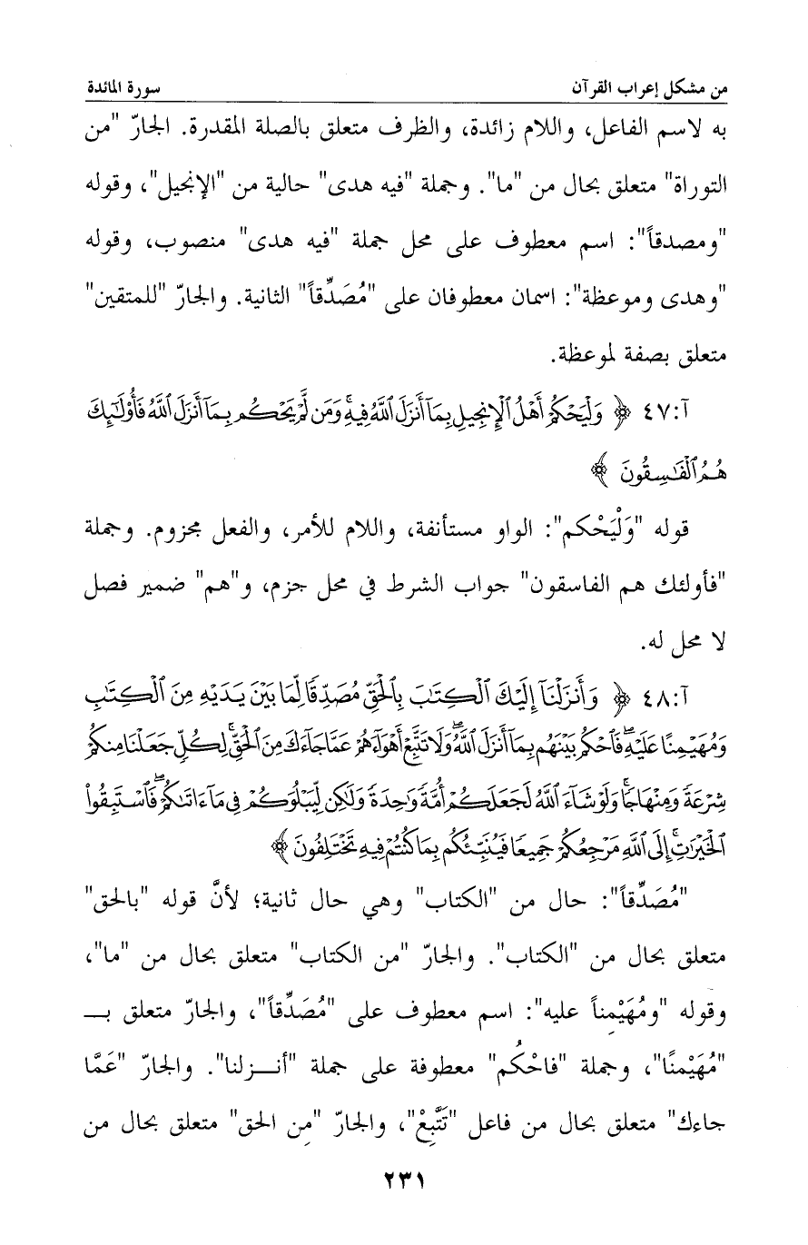 «مصدقا» : حال من «الكتاب» وهي حال ثانية؛ لأن قوله «بالحق» متعلق بحال من «الكتاب» . والجار «من الكتاب» متعلق بحال من «ما» ، وقوله «ومُهيمِنًا عليه» : اسم معطوف على «مصدِّقًا» ، والجار متعلق بـ «مهيمنًا» ، وجملة «فاحكم» معطوفة على جملة أنزلنا. والجار «عَمَّا جاءك» متعلق بحال من فاعل «تَتَّبِعْ» ، والجار «مِن الحق» متعلق بحال من