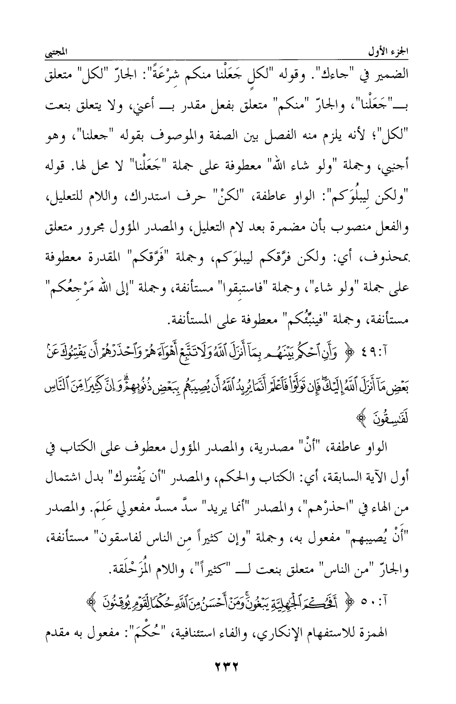 الضمير في «جاءك» . وقوله «لكلٍ جَعلنا منكم شِرْعَةً» : الجار «لكل» متعلق بـ «جعلنا» ، والجار «منكم» متعلق بفعل مقدر بـ أعني، ولا يتعلق بنعت «لكل» ؛ لأنه يلزم منه الفصل بين الصفة والموصوف بقوله «جعلنا» ، وهو أجنبي، وجملة «ولو شاء الله» معطوفة على جملة «جَعلنا» لا محل لها. قوله «ولكن لِيبلُوَكم» : الواو عاطفة، «لكنْ» حرف استدراك، واللام للتعليل، والفعل منصوب بأن مضمرة بعد لام التعليل، والمصدر المؤول مجرور متعلق بمحذوف، أي: ولكن فرَّقكم ليبلوكم، وجملة «فرَّقكم» المقدرة معطوفة على جملة «ولو شاء» ، وجملة «فاستبِقوا» مستأنفة، وجملة «إلى الله مرجعُكم» مستأنفة، وجملة «فينبئُكم» معطوفة على المستأنفة.