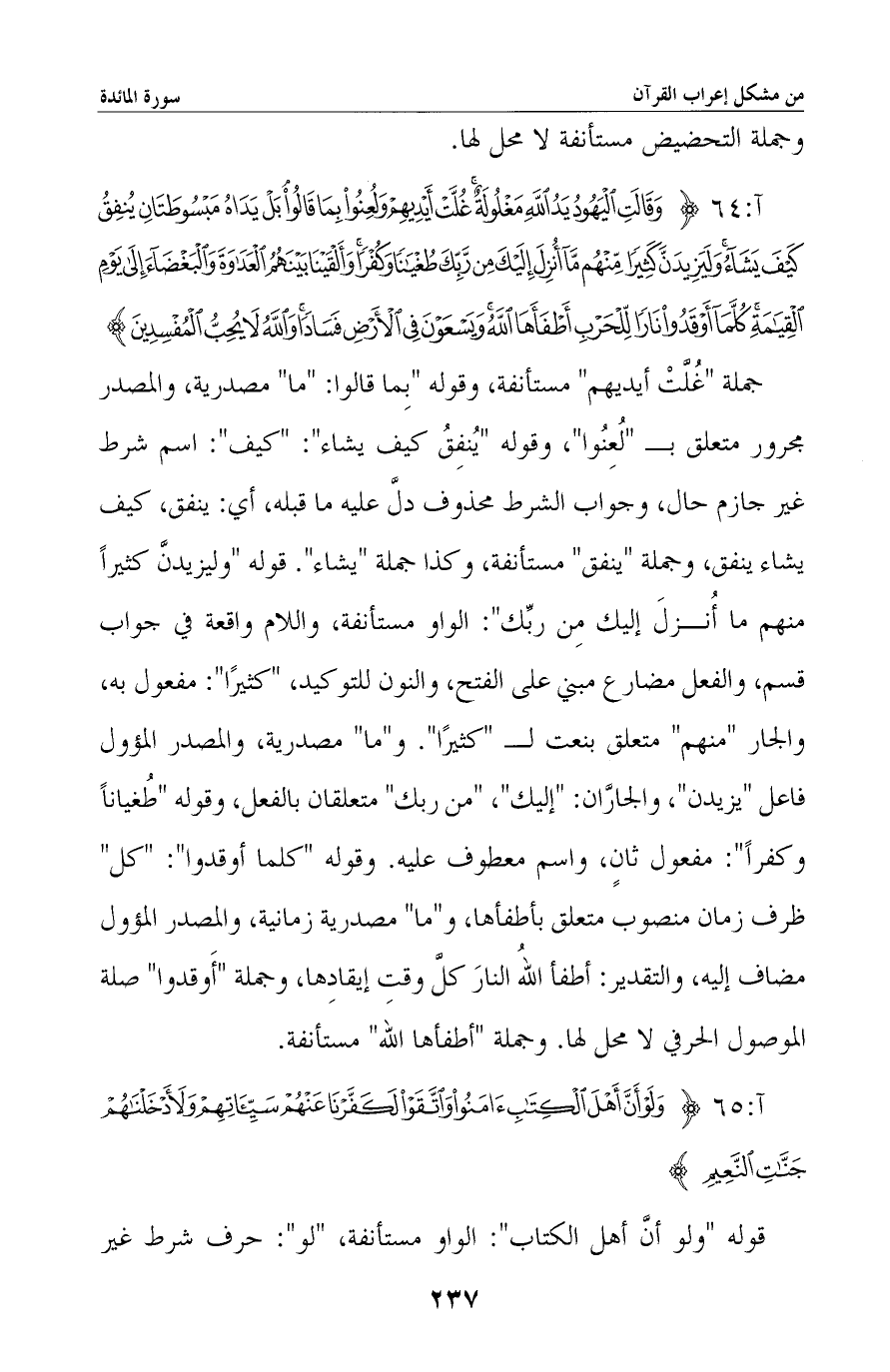 جملة «غُلَّت أيديهم» مستأنفة، وقوله «بِمَا قالوا» : «ما» مصدرية، والمصدر مجرور متعلق بـ «لُعِنُوا» ، وقوله «يُنفِقُ كيف يشاء» : «كيف» : اسم شرط غير جازم حال، وجواب الشرط محذوف دلَّ عليه ما قبله، أي: ينفق كيف يشاء ينفق، وجملة «ينفق» مستأنفة، وكذا جملة «يشاء» . قوله «وليزيدن كثيرًا منهم ما أُنزلَ إليك مِن ربِّك» : الواو مستأنفة، واللام واقعة في جواب قسم، والفعل مضارع مبني على الفتح، والنون للتوكيد، «كثيرًا» : مفعول به، والجار «منهم» متعلق بنعت لـ «كثيرًا» . و «ما» مصدرية، والمصدر المؤول فاعل «يزيدن» ، والجارَّان متعلقان بالفعل، وقوله «طُغيانًا وكفرًا» : مفعول ثانٍ، واسم معطوف عليه. وقوله «كلما أوقدوا» : «كل» ظرف زمان منصوب متعلق بأطفأها، و «ما» مصدرية زمانية، والمصدر المؤول مضاف إليه، والتقدير: أطفأ الله النار كلَّ وقت إيقادها، وجملة «أَوقدوا» صلة الموصول الحرفي لا محل لها. وجملة «أَطفأَها اللهُ» مستأنفة.
