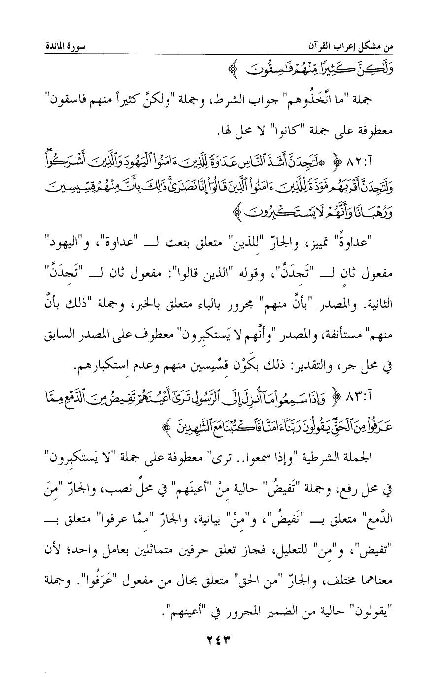 الجملة الشرطية «وإذا سمعوا.. ترى» معطوفة على جملة «لا يَستكبِرون» في محل رفع، وجملة «تَفيضُ» حال من «أعينَهم» في محل نصب، والجار «مِن الدَّمع» متعلق بـ «تَفيضُ» ، و «مِن» بيانية، والجار «مما عرفوا» متعلق بـ «تفيض» ، و «مِن» للتعليل، فجاز تعلق حرفين متماثلين بعامل واحد؛ لأن معناهما مختلف، والجار «من الحق» متعلق بحال من مفعول «عَرَفُوا» . وجملة «يقولون» حال من الضمير المجرور في «أعينهم» .