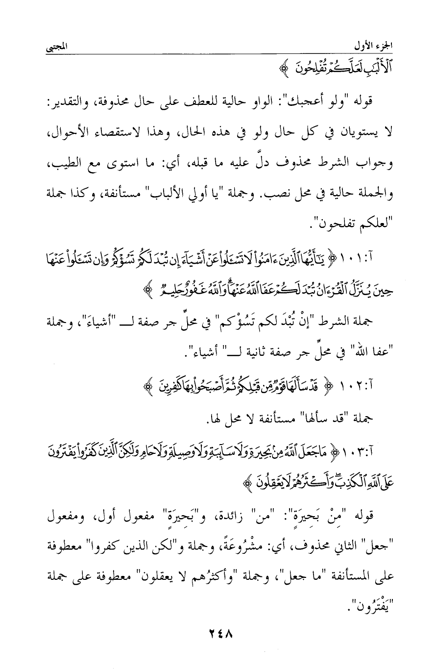 قوله «من بَحِيرَةٍ» : «من» زائدة، و «بَحِيرَةٍ» مفعول أول، ومفعول «جعل» الثاني محذوف، أي: مشْرُوعَةً، وجملة و «لكن الذين كفروا» معطوفة على المستأنفة «ما جعل» ، وجملة «وأكثرُهم لا يعقلونَ» معطوفة على جملة «يَفْتَرُونَ» .