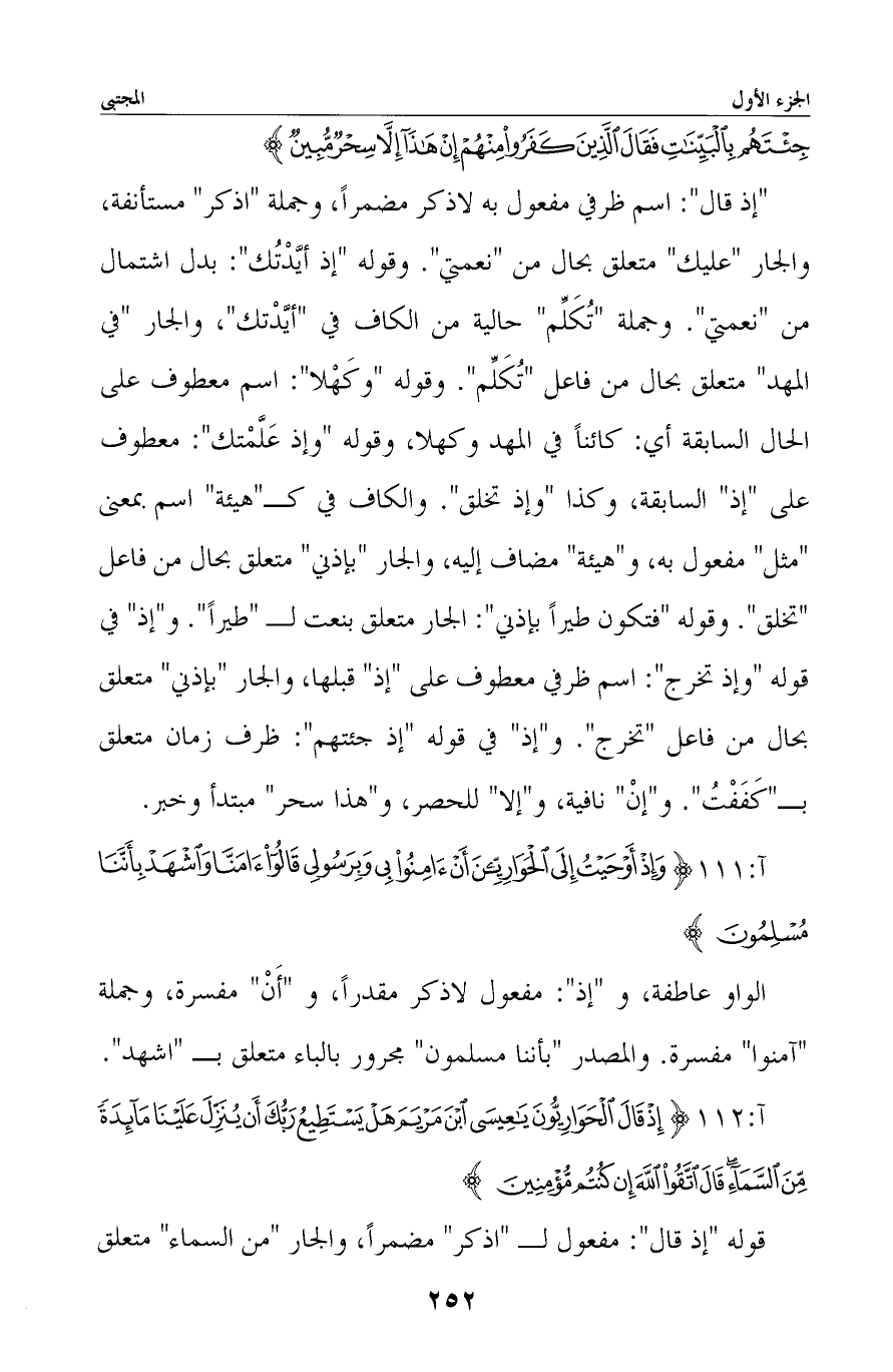قوله «إذ قال» : مفعول لـ «اذكر» مضمرًا، والجار «من السماء» متعلق -[253]- بنعت لـ «مائدة» . وجملة «إن كنتم مؤمنين» مستأنفة، وجواب الشرط محذوف دل عليه ما قبله.
