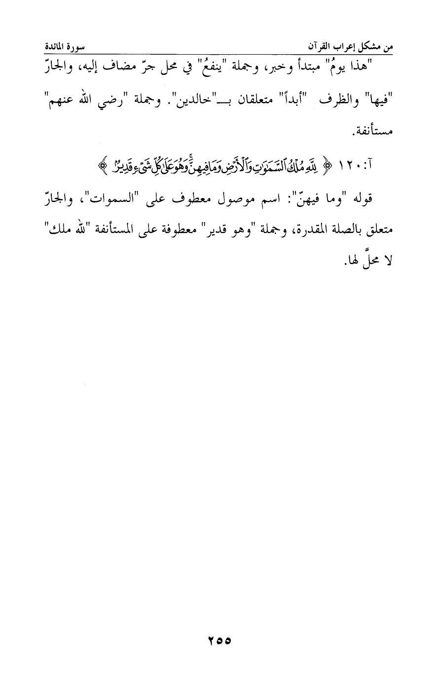 قوله «وما فيهن» : اسم موصول معطوف على «السماوات» ، والجار متعلق بالصلة المقدرة، وجملة «وهو قدير» معطوفة على المستأنفة «لله ملك» لا محل لها.