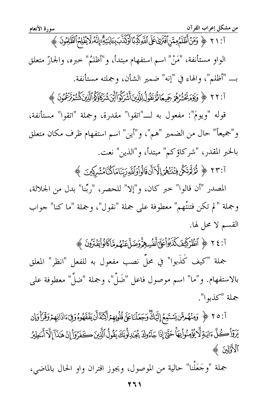 جملة «وجعلنا» حال من الموصول، ويجوز اقتران واو الحال بالماضي، -[262]- والمصدر «أن يفقهوه» مفعول لأجله، أي: كراهة. والجار «في آذانهم» متعلق بحال من «وَقْرًا» ، و «وقرًا» معطوف على «أكنَّة» . «حتى» ابتدائية، والجملة الشرطية بعدها مستأنفة، وجملة «يجادلونك» حال من الواو في «جاءوك» وجملة «يقول» جواب الشرط لا محل لها.