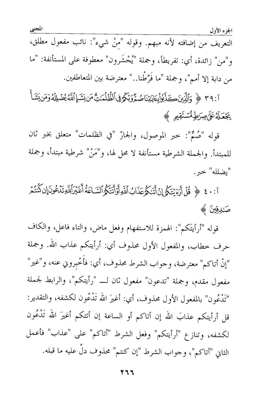 قوله «أرأيتكم» : الهمزة للاستفهام وفعل ماض، وفاعل، والكاف حرف خطاب، والمفعول الأول محذوف أي: أرأيتكم عذاب الله. وجملة «إن أتاكم» معترضة، وجواب الشرط محذوف، أي: فأخبروني عنه، و «غير» مفعول مقدم، وجملة «تدعون» مفعول ثان لـ «رأيتكم» ، والرابط لجملة «تدعون» بالمفعول الأول محذوف، أي: أغير الله تدعون لكشفه، والتقدير: قل أرأيتكم عذاب الله إن أتاكم أو الساعة إن أتتكم أغير الله تدعون لكشفه، وتنازع «أرأيتكم» وفعل الشرط «أتاكم» على «عذاب» فأعمل الثاني «أتاكم» ، وجواب الشرط «إن كنتم» محذوف دلَّ عليه ما قبله.