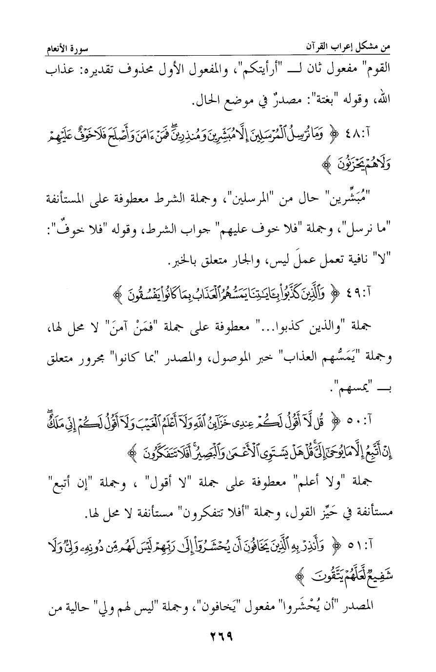 «مبشرين» حال من «المرسلين» ، وجملة الشرط معطوفة على المستأنفة «ما نرسل» ، وجملة «فلا خوف عليهم» جواب الشرط، وقوله «فلا خوف» : «لا» نافية تعمل عمل ليس، والجار متعلق بالخبر.