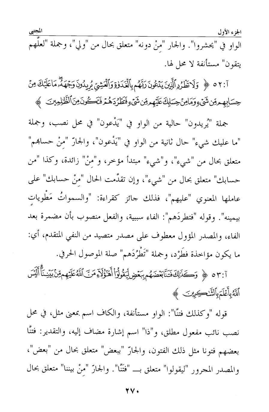 جملة «يريدون» حالية من الواو في «يَدْعون» في محل نصب، وجملة «ما عليك شيء» حال ثانية من الواو في «يدعون» ، والجار «من حسابهم» متعلق بحال من «شيء» ، و «شيء» مبتدأ مؤخر، و «من» زائدة، وكذا «من حسابك» متعلق بحال من «شيء» ، وإن تقدَّمت الحال «من حسابك» على عاملها المعنوي «عليهم» ، فذلك جائز كقراءة: {وَالسَّمَاوَاتُ مَطْوِيَّاتٌ بِيَمِينِهِ} . وقوله «فتطردهم» : الفاء سببية، والفعل منصوب بأن مضمرة بعد الفاء، والمصدر المؤول معطوف على مصدر متصيد من النفي المتقدم، أي: ما يكون مؤاخذة فطَرْد، وجملة «فتطردهم» صلة الموصول الحرفي.