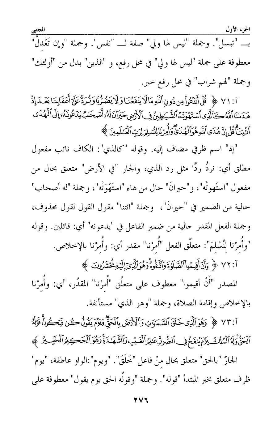 «إذ» اسم ظرفي مضاف إليه. وقوله «كالذي» : الكاف نائب مفعول مطلق أي: نردُّ ردًّا مثل رد الذي، والجار «في الأرض» متعلق بحال من مفعول «استهوته» ، و «حيران» حال من هاء «استهوته» ، وجملة «له أصحاب» حال من الضمير في «حيران» ، وجملة «ائتنا» مقول القول لقول محذوف، والفعل المقدر حال من ضمير الفاعل في «يدعونه» أي: قائلين. وقوله «وأمرنا لنسلم» : متعلَّق الفعل «أُمِرْنا» مقدر أي: وأُمِرْنا بالإخلاص.