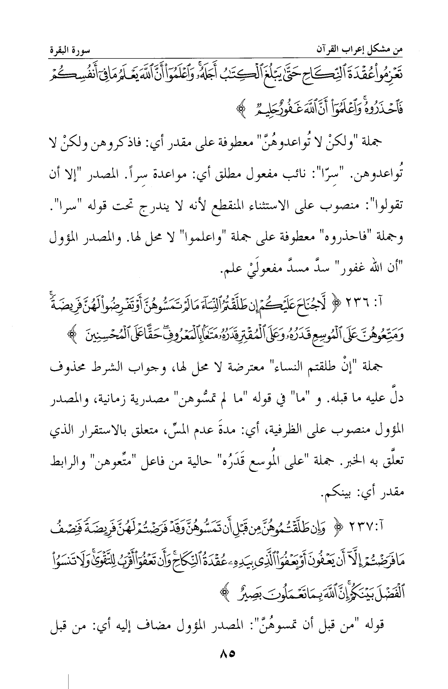 قوله «من قبل أن تمسوهُنَّ» : المصدر المؤول مضاف إليه أي: من قبل -[86]- المسِّ. جملة «وقد فرضتم» حالية من الواو في «تمسُّوهن» . قوله «فنصف» : مبتدأ، والخبر مقدر أي: عليكم، و «ما» موصول مضاف إليه. «إلا أن يعفون» : الفعل المضارع مبني على السكون لاتصاله بنون النسوة في محل نصب، والمصدر منصوب على الاستثناء المنقطع؛ لأن عفوهن عن النصف ليس من جنس أخذهن، والتقدير: إلا حال عفوهن. والمصدر «وأن تعفوا» مبتدأ، و «أقرب» خبره، وجملة «عفوكم أقرب» مستأنفة لا محل لها، وجملة «ولا تنسوا» معطوفة على الاسمية «عفوكم أقرب» .