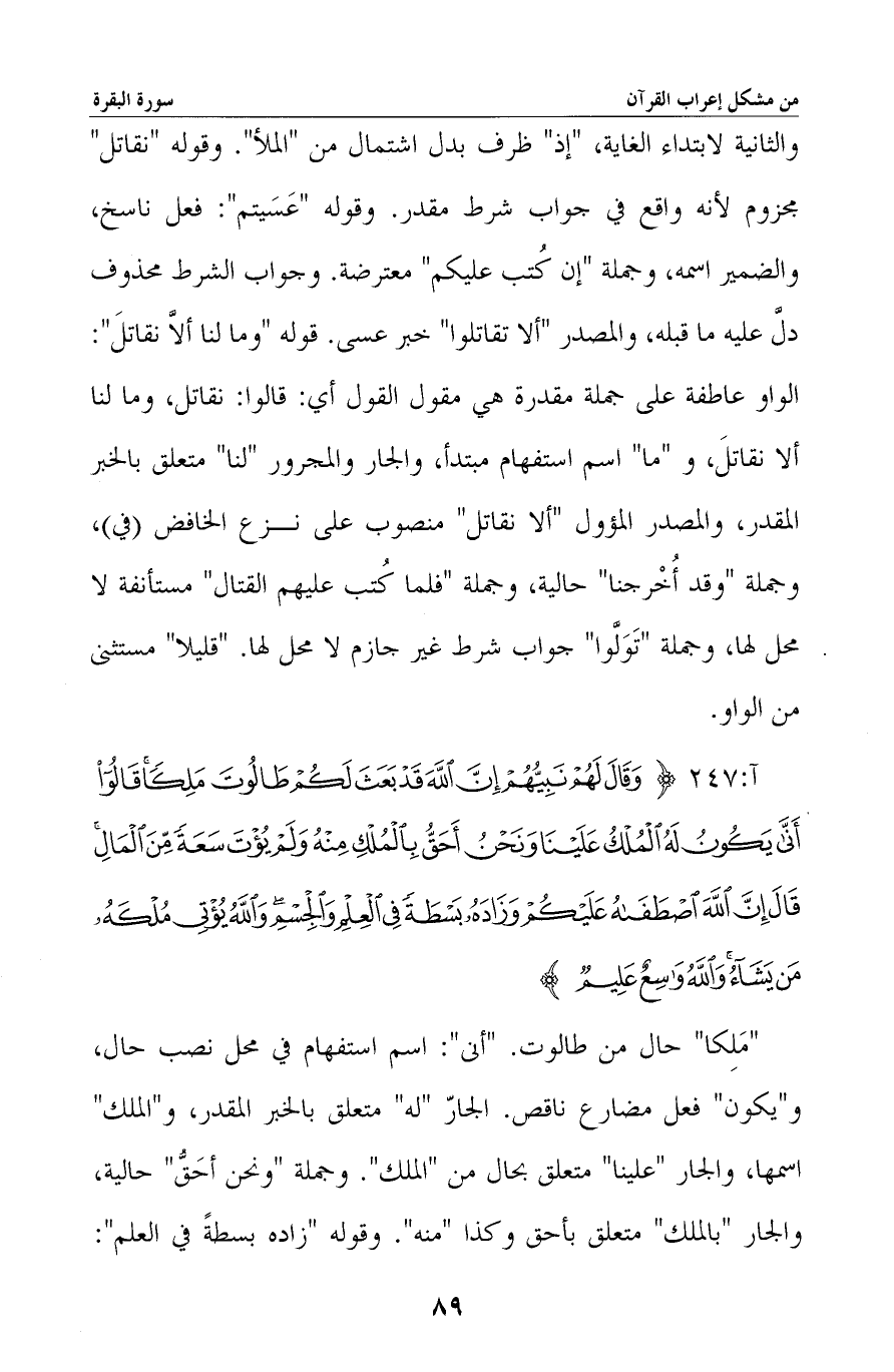 «ملكا» حال من طالوت. «أنى» : اسم استفهام في محل نصب حال، و «يكون» فعل مضارع ناقص. الجار «له» متعلق بالخبر المقدر، و «الملك» اسمها، والجار «علينا» متعلق بحال من «الملك» . وجملة «ونحن أحق» حالية، والجار «بالملك» متعلق بأحق وكذا «منه» . وقوله «زاده بسطة في العلم» : -[90]- تعدَّى الفعل إلى مفعولين، وتعلَّق الجار والمجرور بنعت مقدر لـ «بسطة» ، ومفعولا «يؤتي» : «ملكه من يشاء» حدث بينهما تقديم وتأخير، فالأول «مَنْ» ، والثاني «ملكه» .