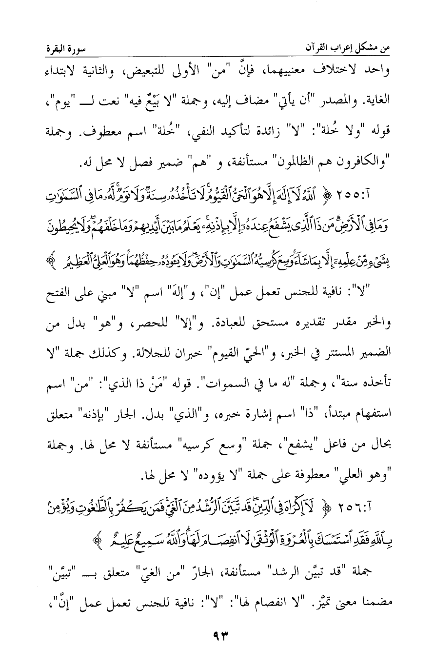 جملة «قد تبيَّن الرشد» مستأنفة، الجار «من الغيّ» متعلق بـ «تبين» مضمنا معنى تميز. «لا انفصام لها» : «لا» : نافية للجنس تعمل عمل «إنَّ» ، -[94]- و «انفصام» اسمها مبني على الفتح، قوله «فمن» : الفاء مستأنفة، «من» اسم شرط مبتدأ. وجملة «والله سميع عليم» مستأنفة، وهما خبران مرفوعان.