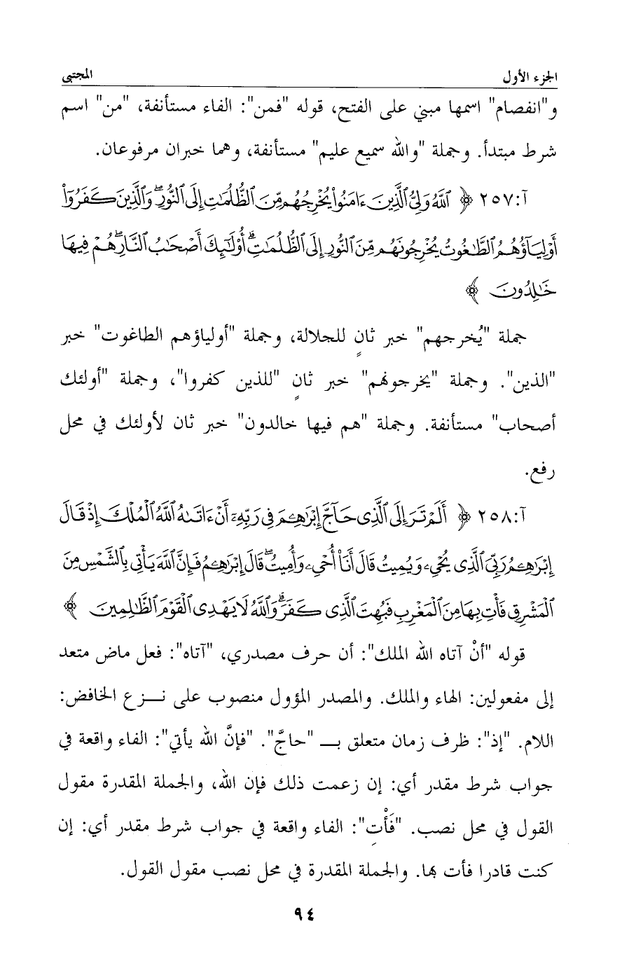 قوله «أن آتاه الله الملك» : أن حرف مصدري، «آتاه» : فعل ماض متعد إلى مفعولين: الهاء والملك. والمصدر المؤول منصوب على نزع الخافض: اللام. «إذ» : ظرف زمان متعلق بـ «حاجَّ» . «فإنَّ الله يأتي» : الفاء واقعة في جواب شرط مقدر أي: إن زعمت ذلك فإن الله، والجملة المقدرة مقول القول في محل نصب. «فأتِ» : الفاء واقعة في جواب شرط مقدر أي: إن كنت قادرا فأت بها. والجملة المقدرة في محل نصب مقول القول.